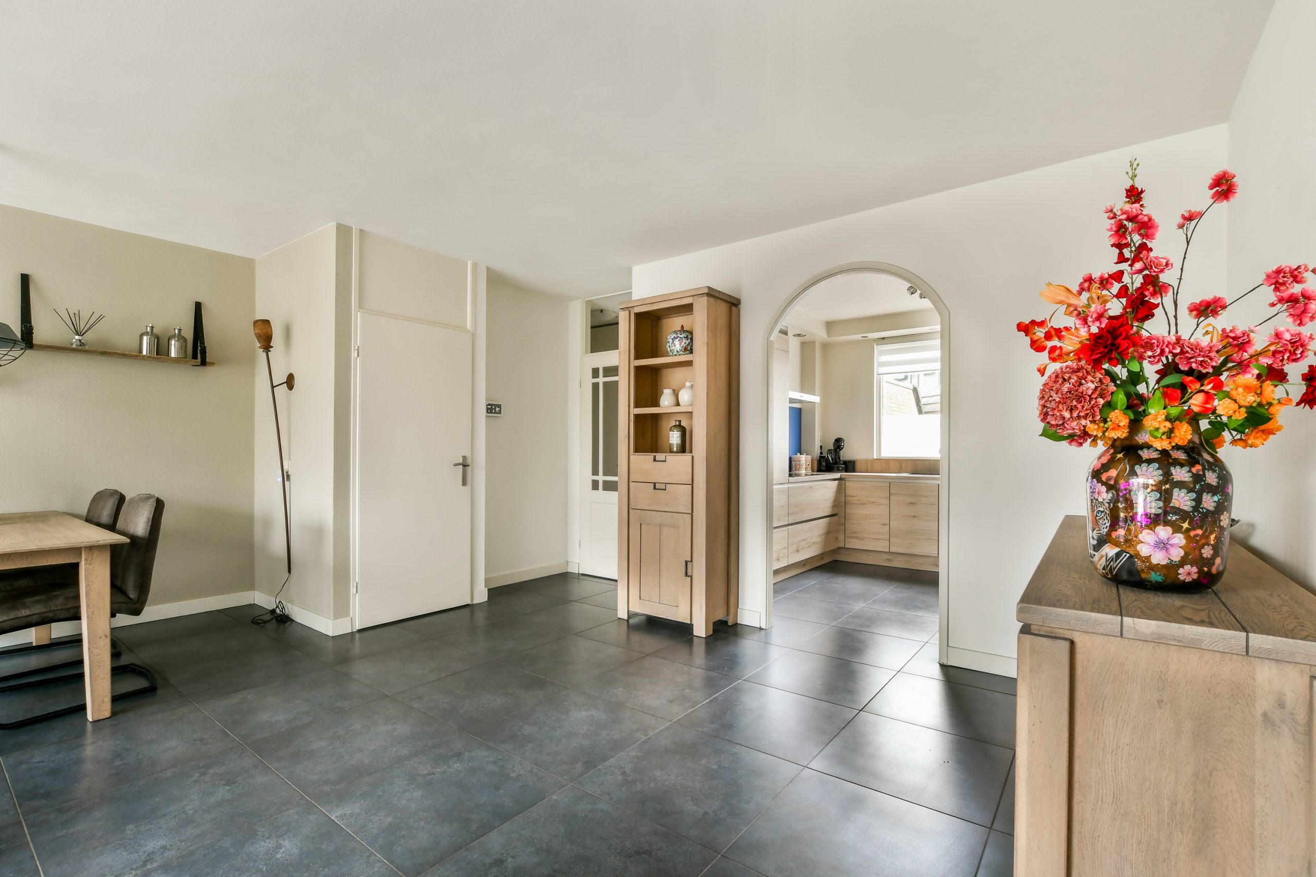 Overdekte entree in de hal voorzien van de meterkast, de nette en deels betegelde toiletruimte en de trapopgang. De ruime woonkamer met airconditioning en convectorverwarming is aan de achterzijde uitgebouwd en voorzien van schuifdeuren richting de onderhoudsvriendelijke en zonnige achtertuin. De vloer is voorzien van mooie vloertegels en er is een praktische, royale trapkast. Via een toog is de moderne keuken bereikbaar, deze is in L-opstelling zo’n 7 jaar geleden geplaatst en van alle gemakken voorzien. Zo beschikt deze onder andere over een inductiekookplaat, combi-oven/magnetron, vaatwasser, koelkast en vriezer.