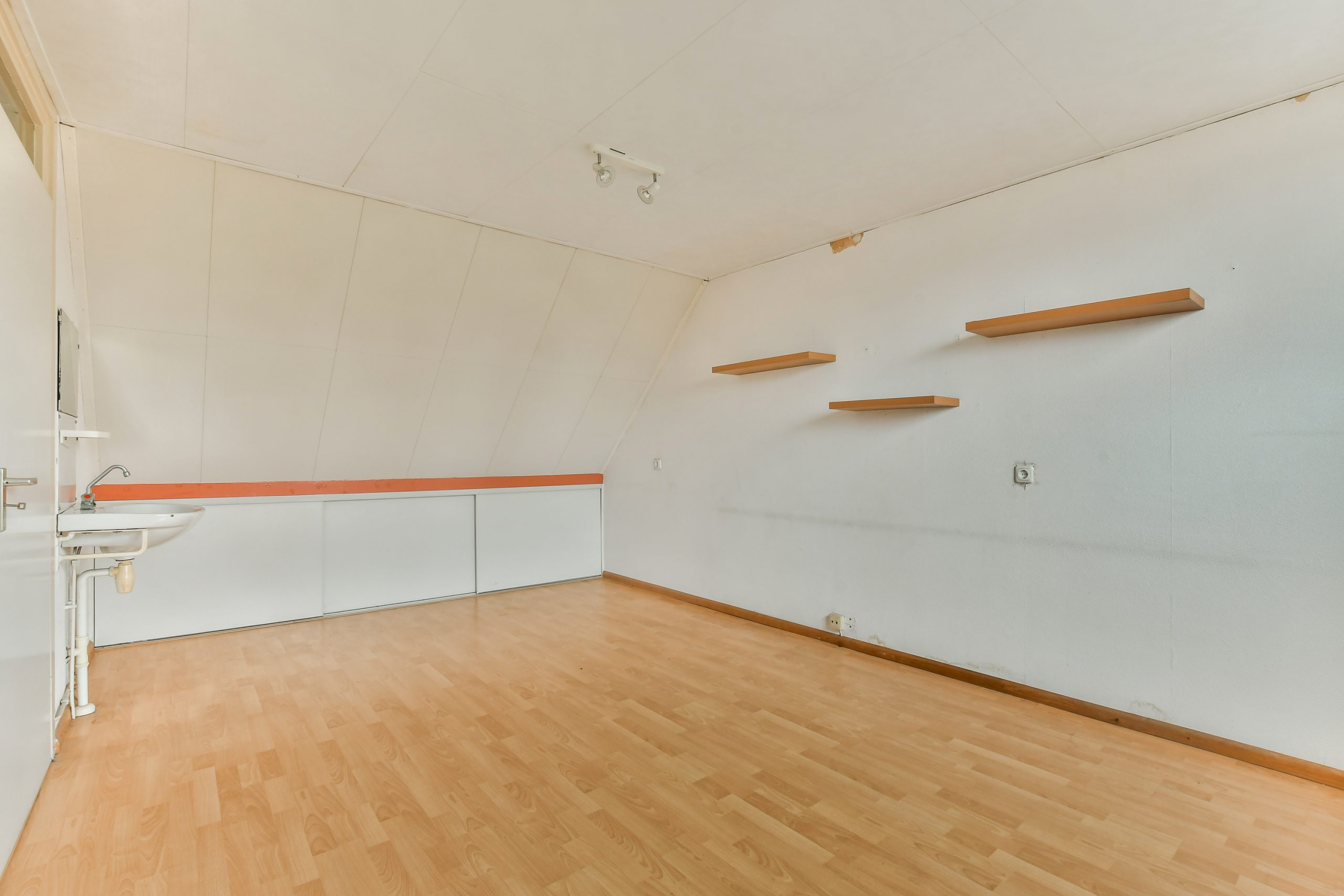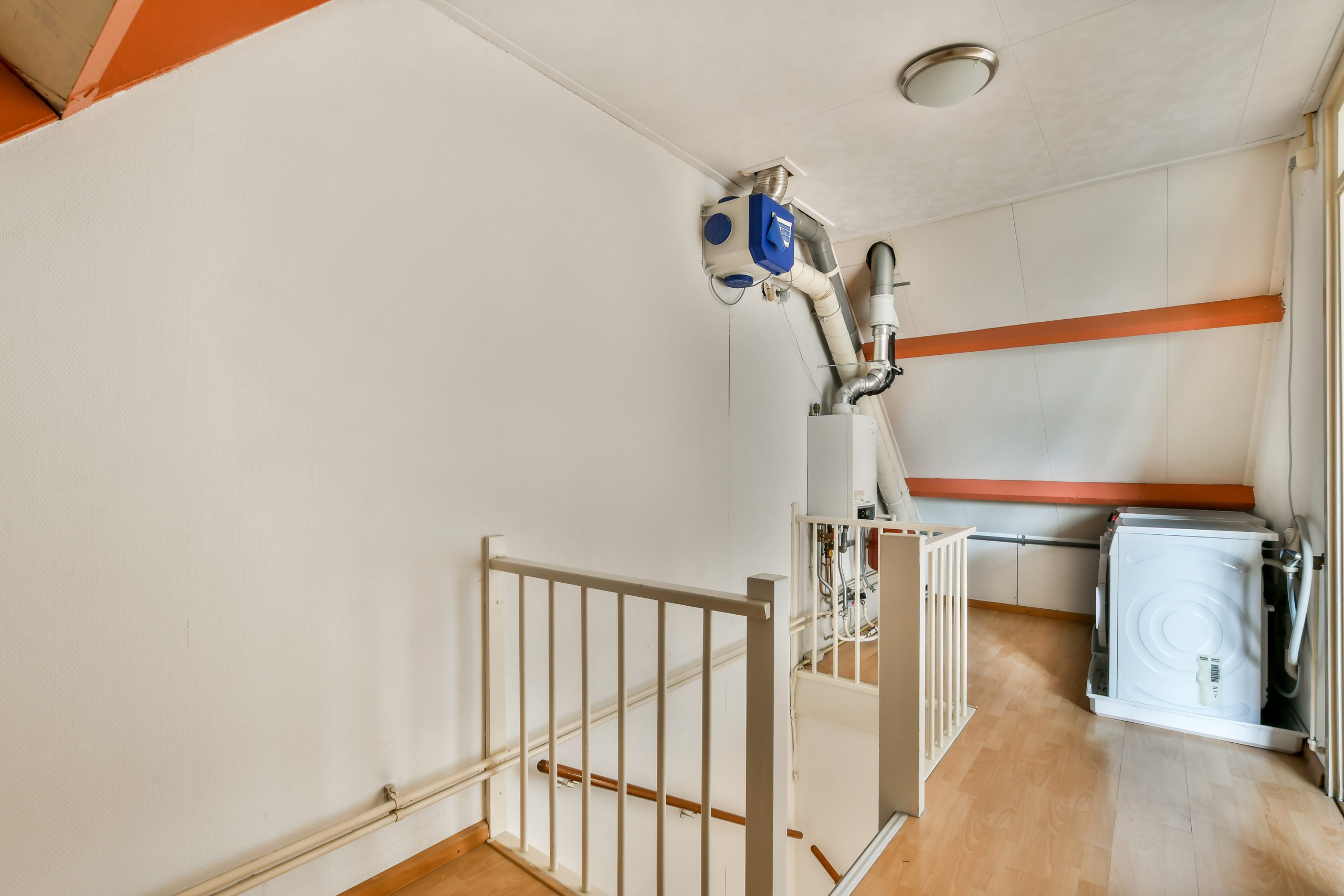 Voorzolder met de witgoedaansluitingen, de cv-installatie, de mechanische ventilatie unit en toegang tot de 4de slaapkamer. Deze ruime slaapkamer is voorzien van een dakkapel met rolluiken en een wastafel. Achter de knieschotten vind je praktische bergruimte. De mogelijkheid bestaat om deze kamer in 2 slaapkamers te splitsen..