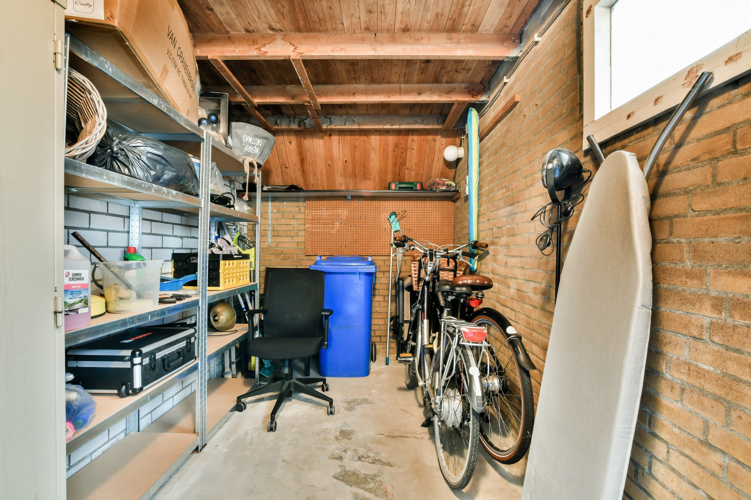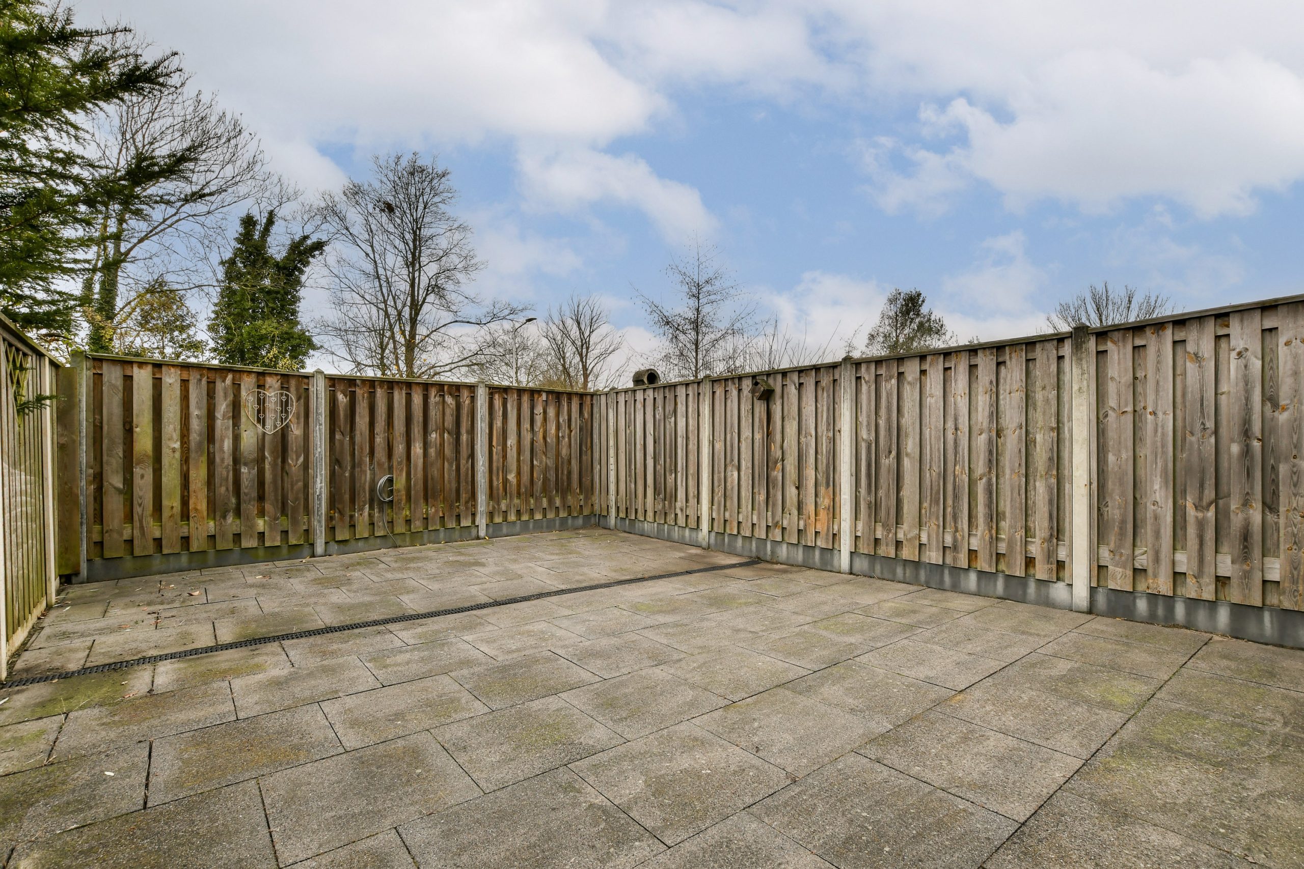 De onderhoudsvriendelijke achtertuin ligt op het zonnige zuidwesten en is volledig bestraat. Je kunt hier naar eigen wens een invulling aan geven en eventueel een achterom creëren. Aan de aanbouw bevindt zich een zonnescherm.