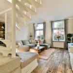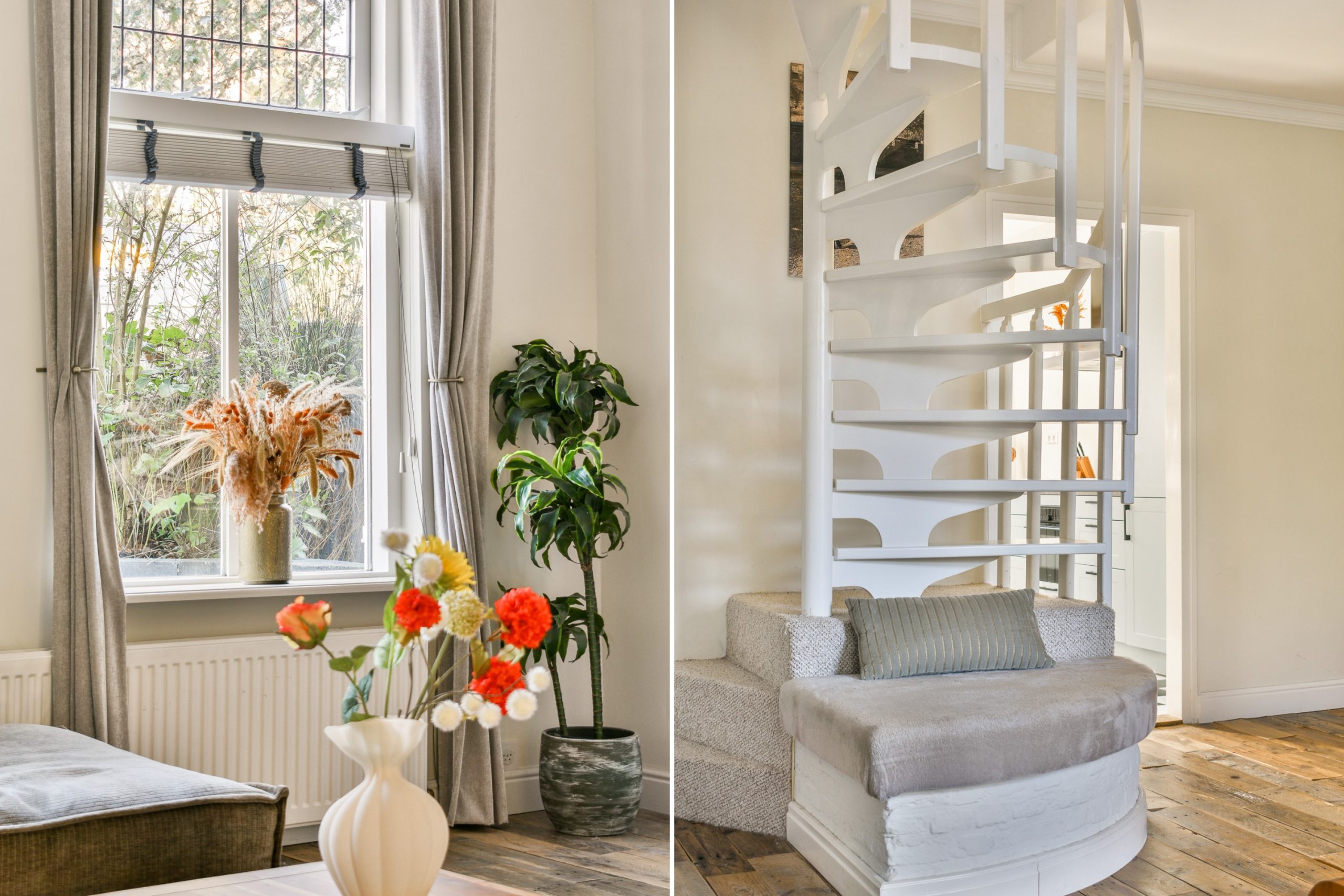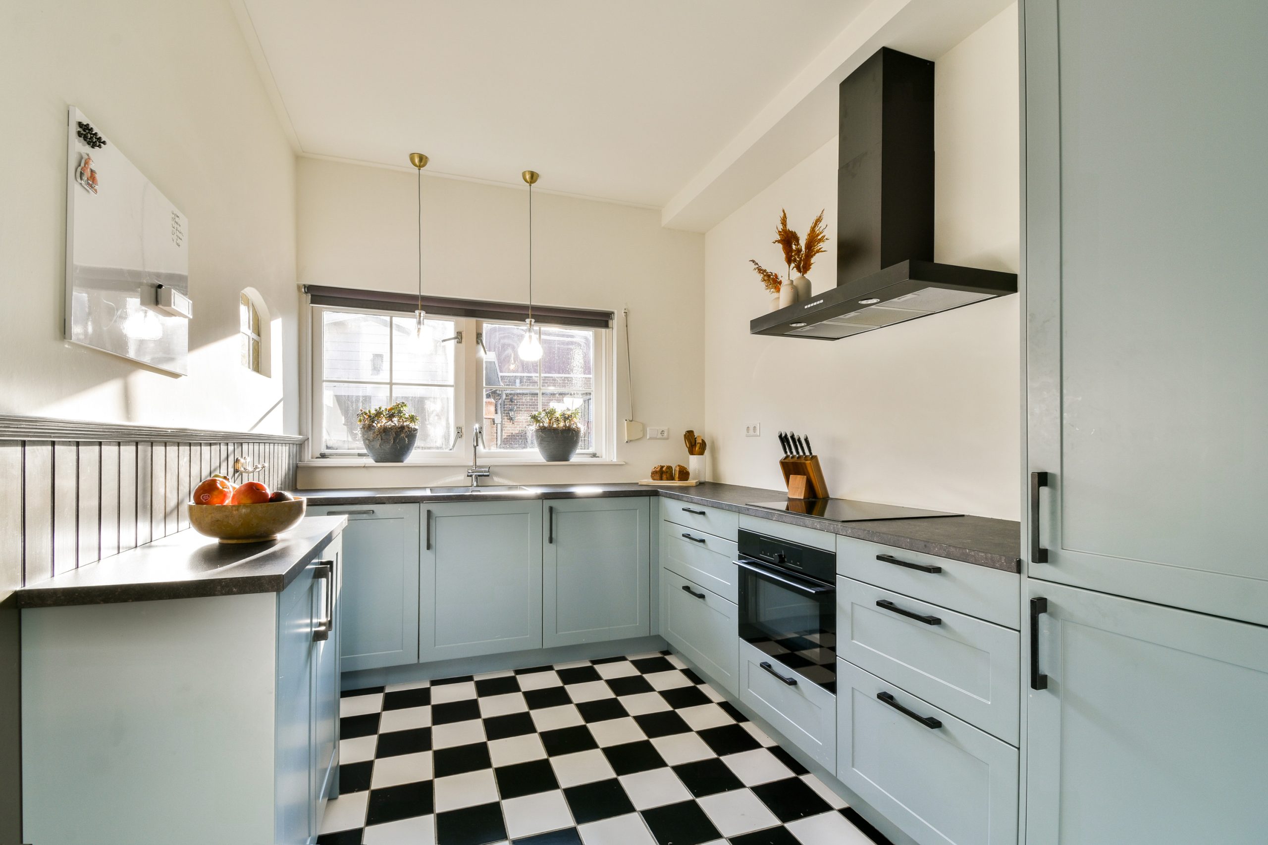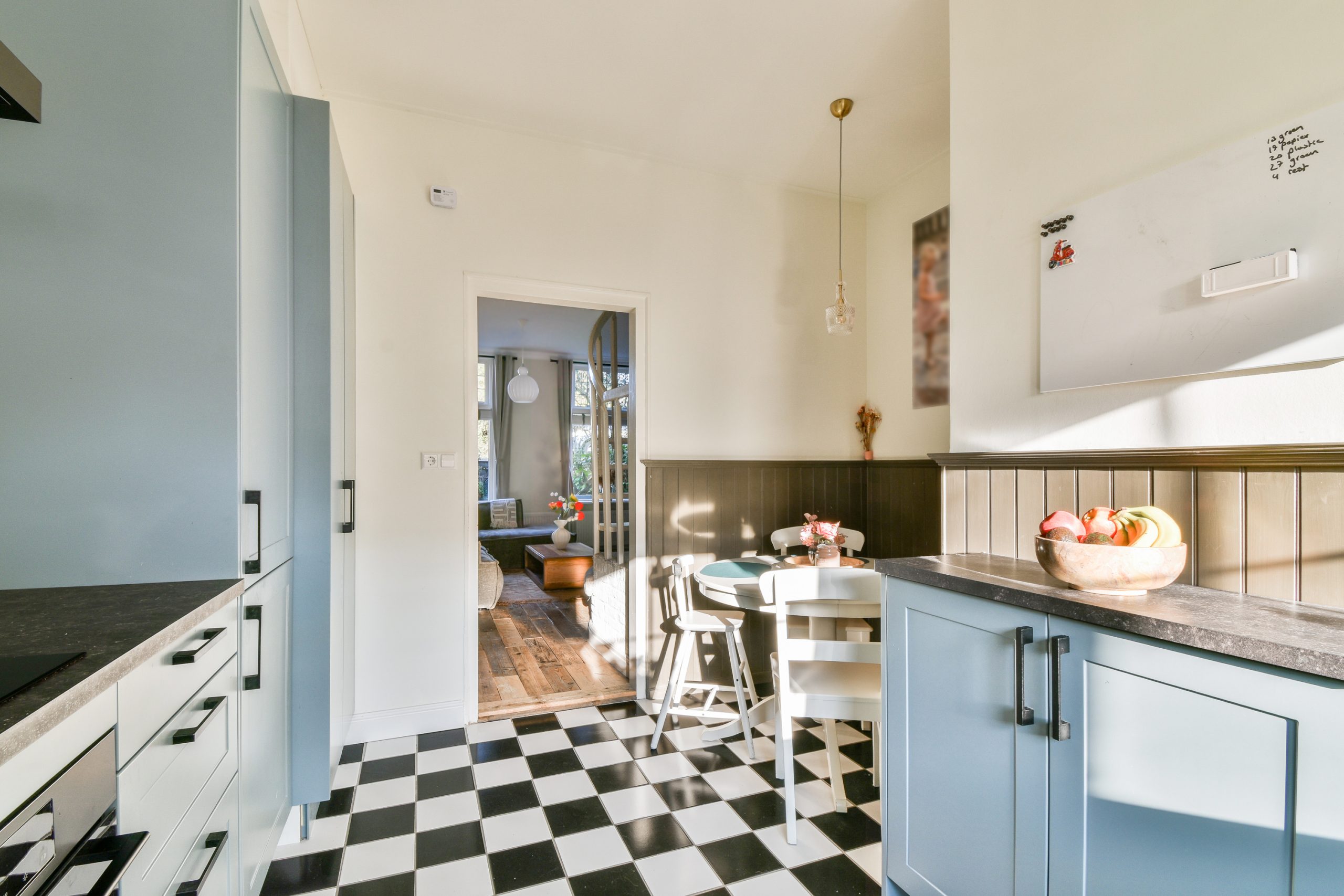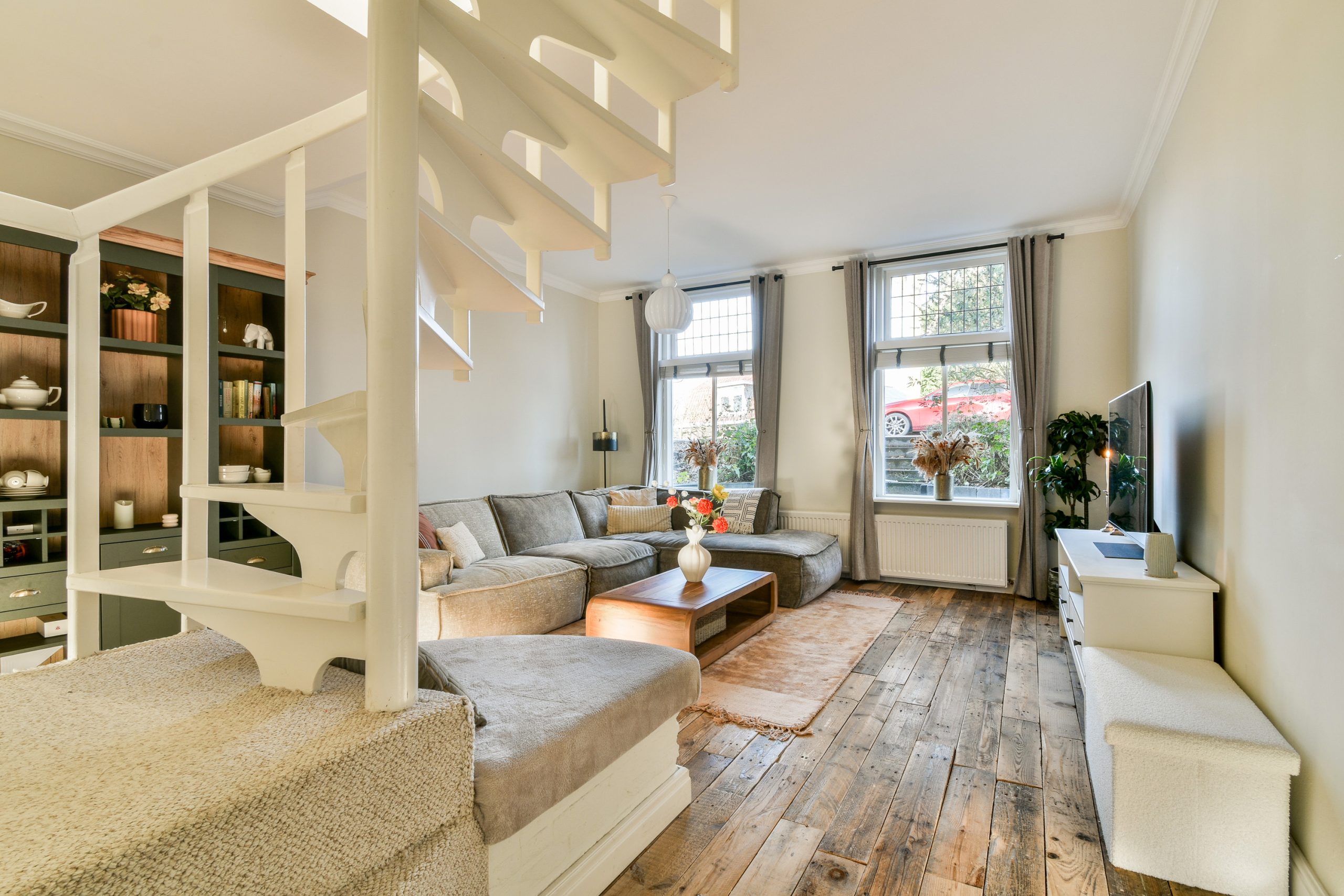 Via de achtertuin vindt de entree plaats in de hal voorzien van een garderoberuimte, de nette en deels betegelde toiletruimte en de meterkast. Vanuit de hal toegang tot de sfeervolle woonkamer met houten vloer en spiltrap naar de etage. Bij de fraaie glas-in-loodramen aan de voorzijde is een gezellige zithoek gecreëerd. De stijlvolle keukenruimte is in 2023 gerenoveerd en voorzien van een L-vormige keukenopstelling. Hierbij zijn kosten noch moeite gespaard en je vindt hier onder andere een inductiekookplaat met afzuigkap, een combi-oven/magnetron, vaatwasser en een koel-vriescombinatie. Daarnaast zijn de witgoed-aansluitingen keurig weggewerkt. Dankzij de royale ruimte is hier voldoende plek voor een eethoek.