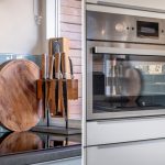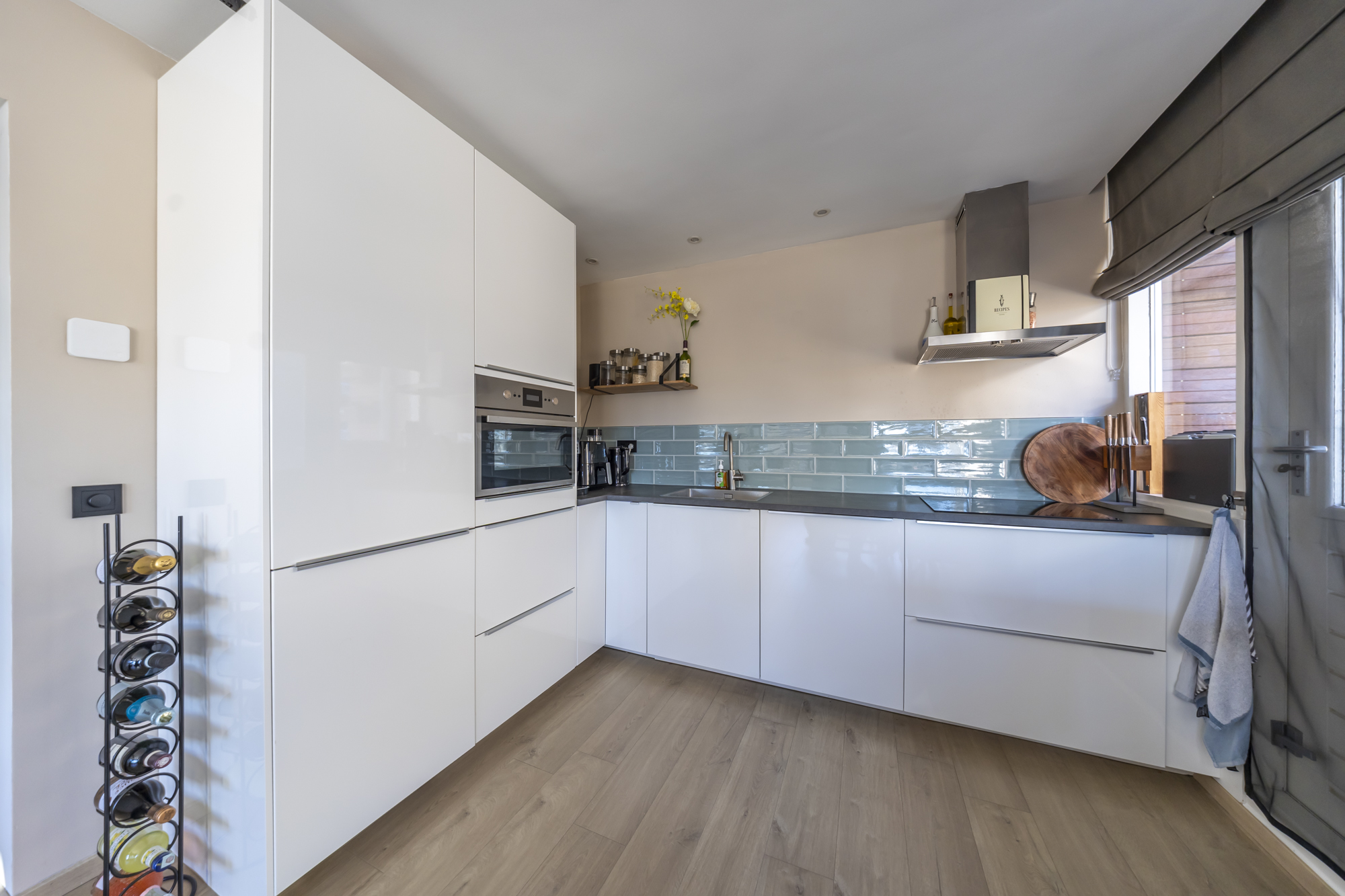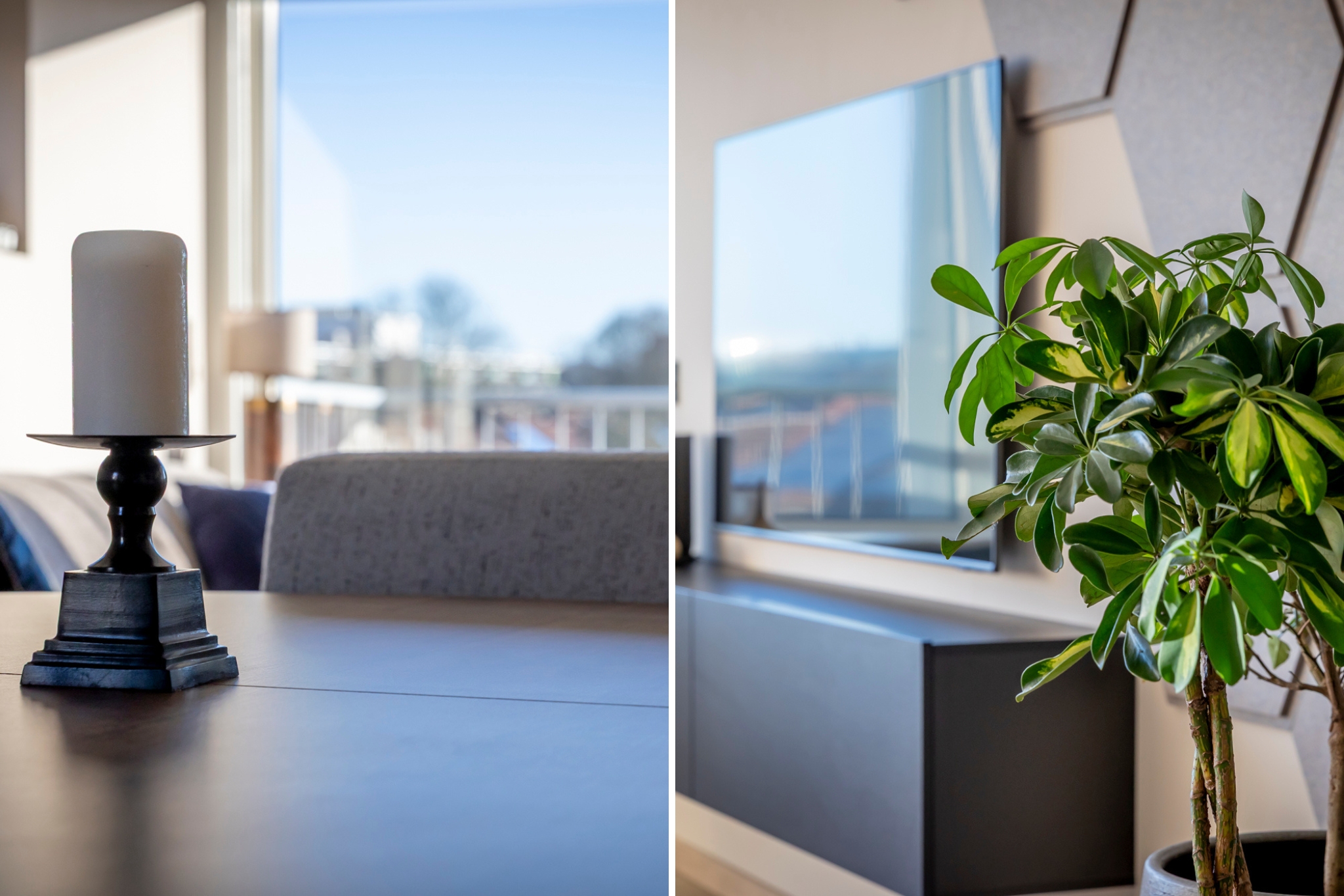 De royale, door licht overgoten woonkamer is uitgerust met airconditioning en vormt samen met de open keuken een fijne en uitnodigende leefruimte. Hier vind je tevens twee balkons – oostgericht en zuidgericht – zodat je op elk moment van de dag kunt genieten van zon óf juist de schaduw.