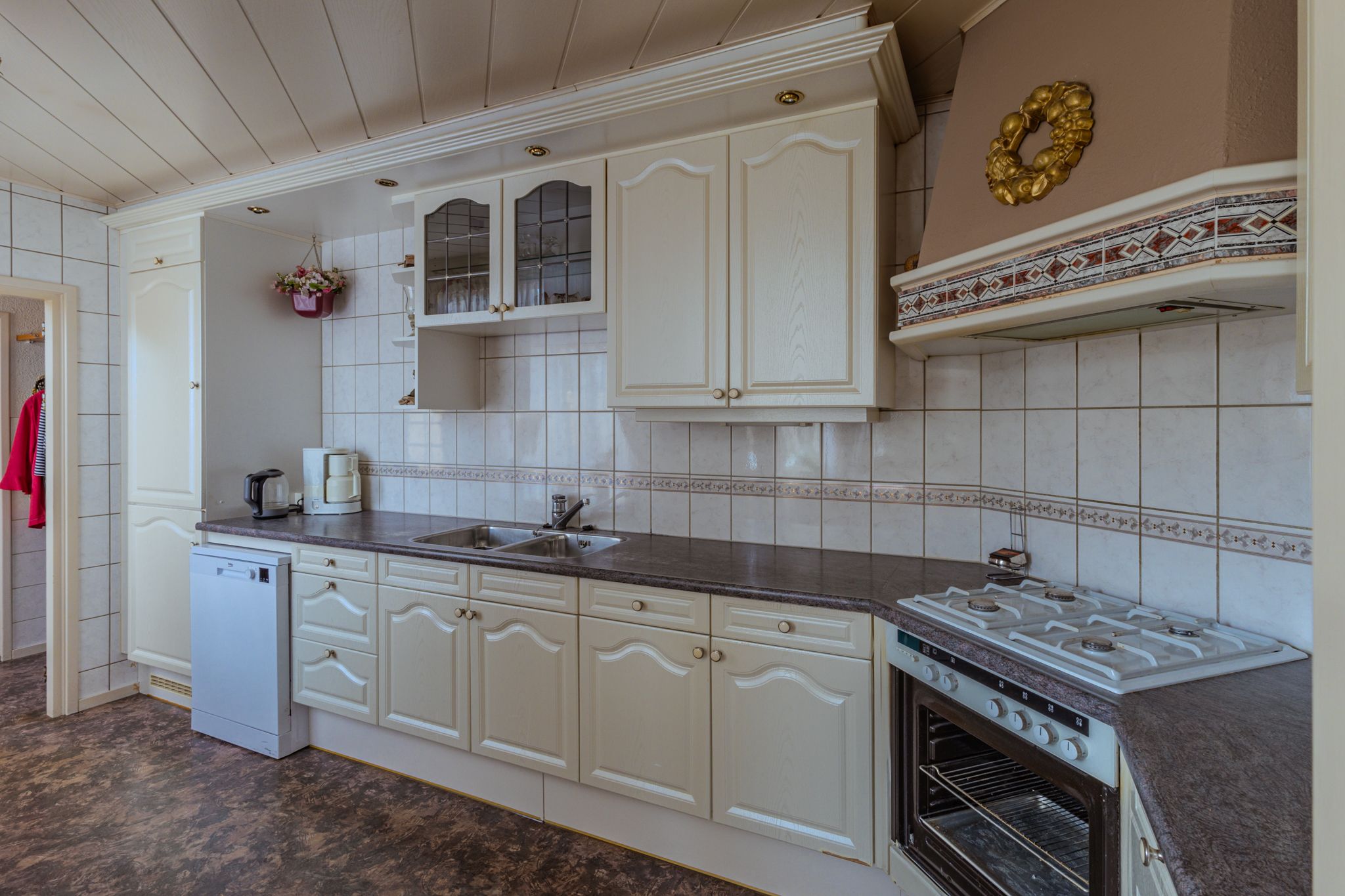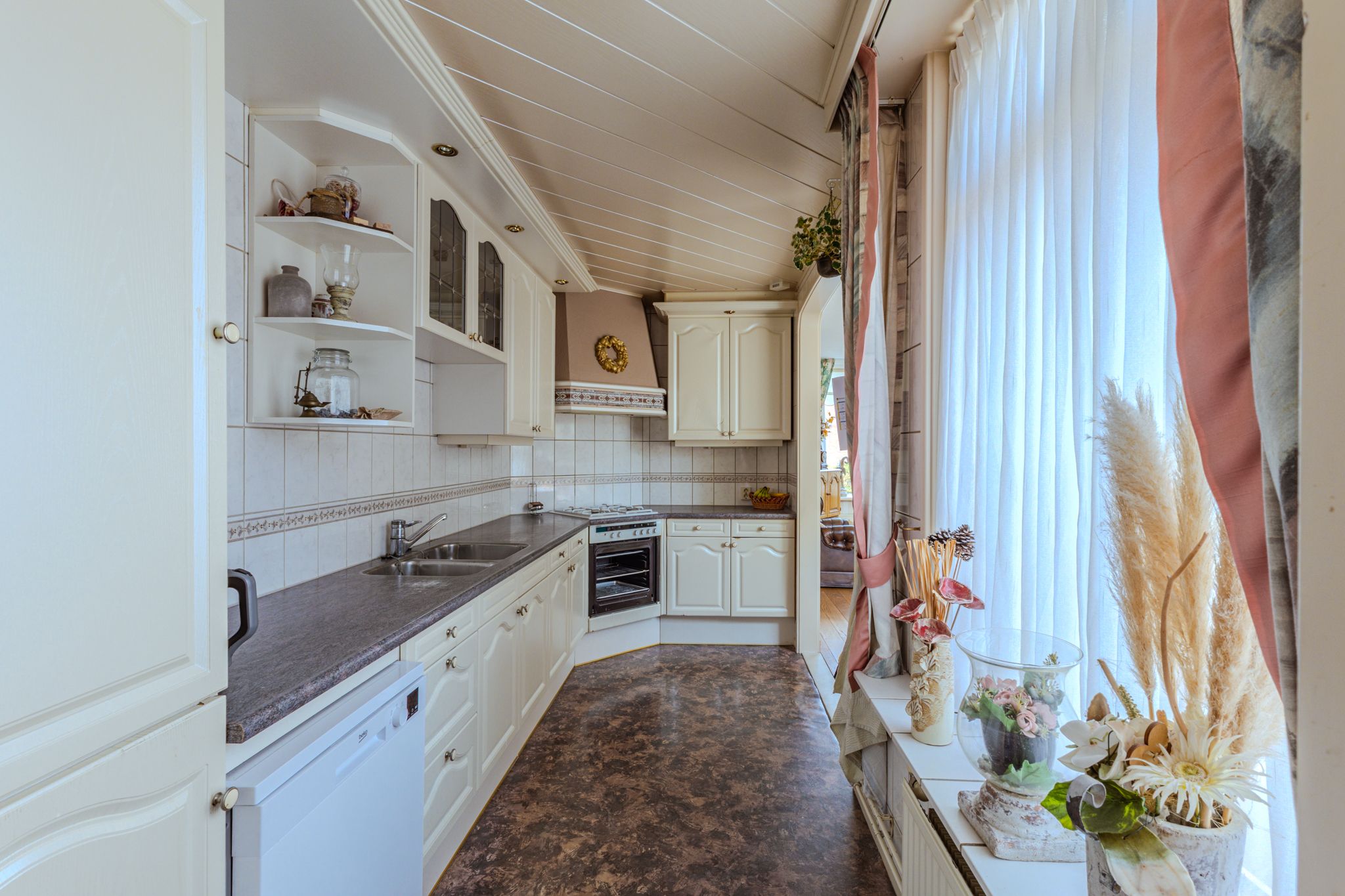 De entree vindt plaats in de hal, welke voorzien is van de trapopgang met nette toiletruimte voorzien van een staand toilet, de garderoberuimte en een praktische trap- / kelderkast. De doorzonwoonkamer heeft zowel aan de voor- als de achterzijde een grote raampartij met zonnescherm wat zorgt voor een prettige hoeveelheid lichtinval. De ruime halfopen keuken in L-opstelling is deels in de aanbouw gesitueerd en naast de vele opbergmogelijkheden voorzien van een gaskookplaat met schouw en een koel-/vriescombinatie. Het tussenportaal biedt een tweede garderoberuimte en geeft toegang tot de tuin en de bijkeuken. Deze royale bijkeuken is uitgerust met de witgoed-aansluitingen en biedt eveneens toegang tot de achtertuin.