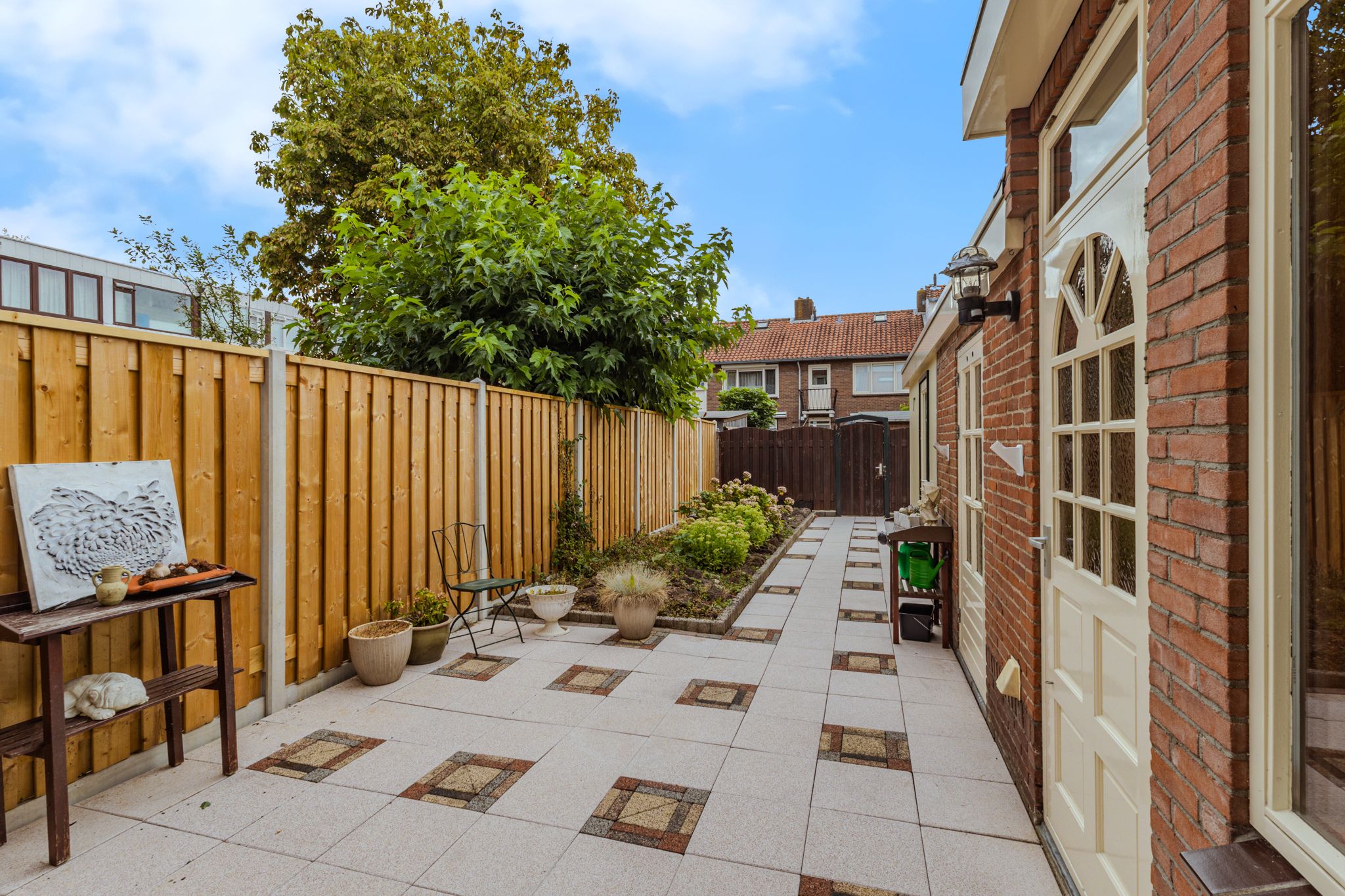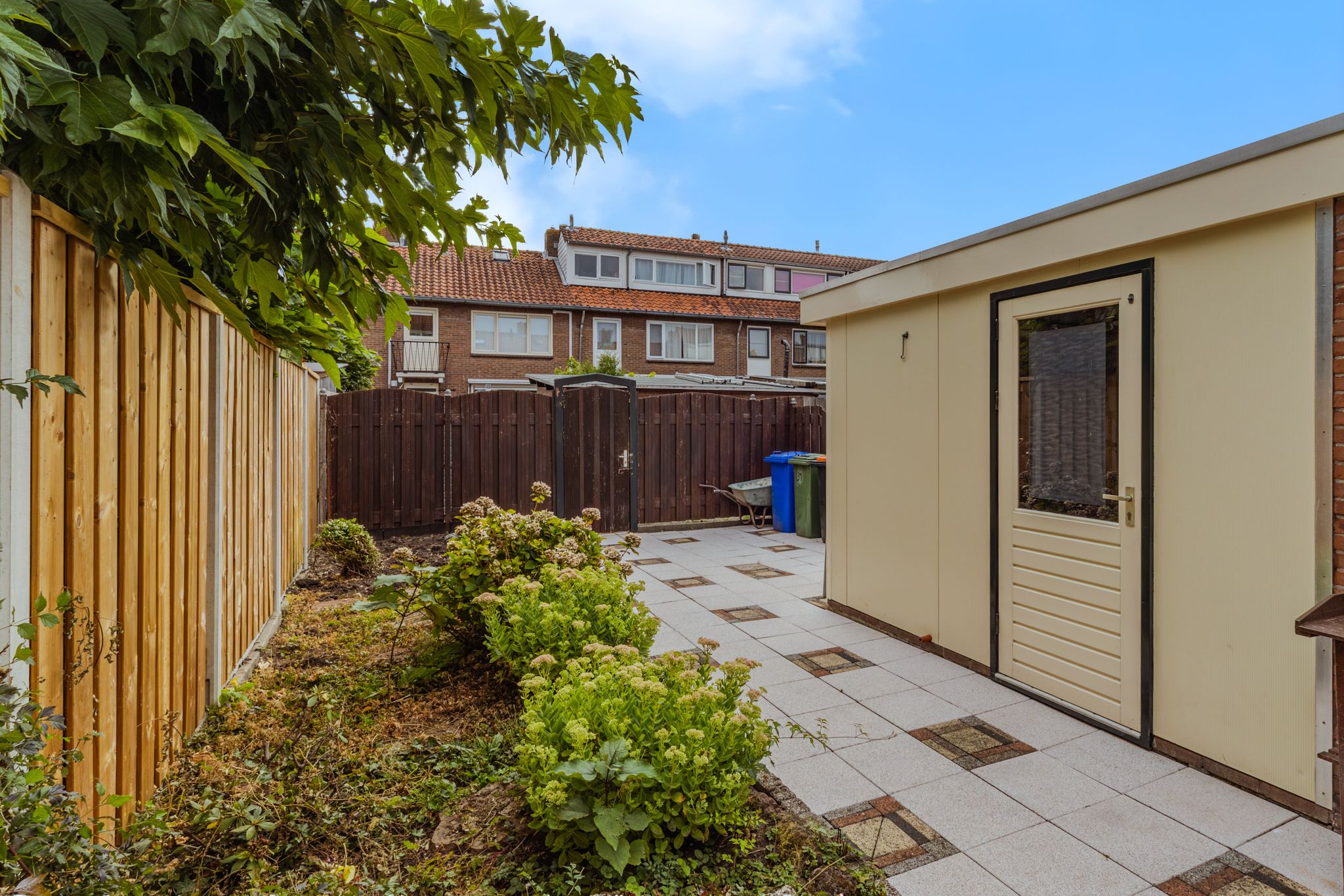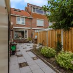 De ca. 15 meter diepe achtertuin is gelegen op het zuidoosten en is grotendeels voorzien van siertegels met een groot plantenborder tegen de schutting. De tuin is geheel omheind met een houten schutting met een achterom naar de achterliggende brandgang en een praktische aangebouwde berging van ca. 6 m².