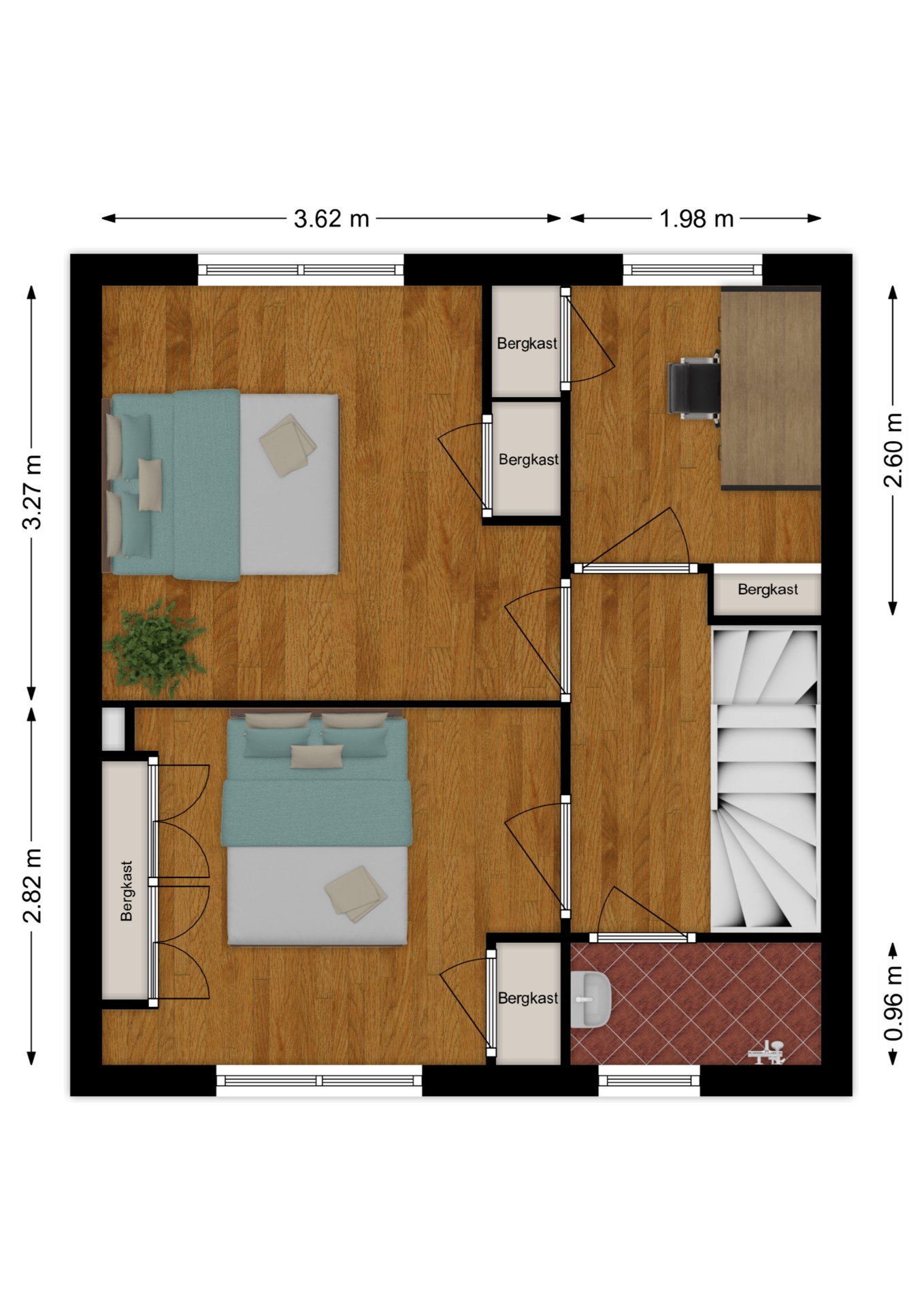 Op de voorzolder vind je de CV-installatie en een vaste kast. De vierde slaapkamer biedt een groot dakraam en bergmogelijkheden achter de knieschotten.