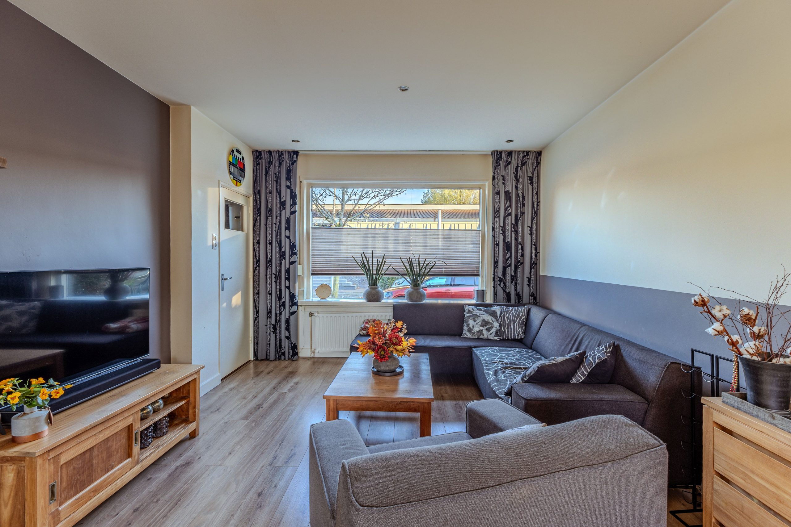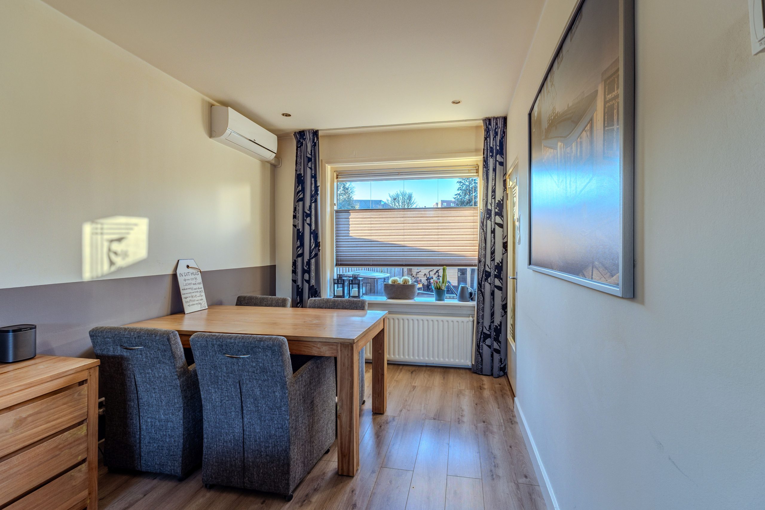 Entree in de hal met de meterkast, garderoberuimte en de trapopgang. De L-vormige doorzonwoonkamer is in 2020 voorzien van airconditioning, waardoor een prettig binnenklimaat altijd gewaarborgd is. De woonkamer is ingedeeld met een zitgedeelte aan de voorzijde waar de raampartij beschikt over een rolluik en een eetgedeelte aan de achterzijde, van waaruit tevens de toegang tot de keuken is. Deze is uitgerust met een combi-oven/magnetron, een vaatwasser, een inductiekookplaat en diverse berglades en kasten. Vanuit de keuken is de achtertuin bereikbaar, waarbij de deur naar de tuin is voorzien van een rolluik. Ook de nette en volledig betegelde toiletruimte is vanuit de keuken bereikbaar en is voorzien van een zwevend toilet.