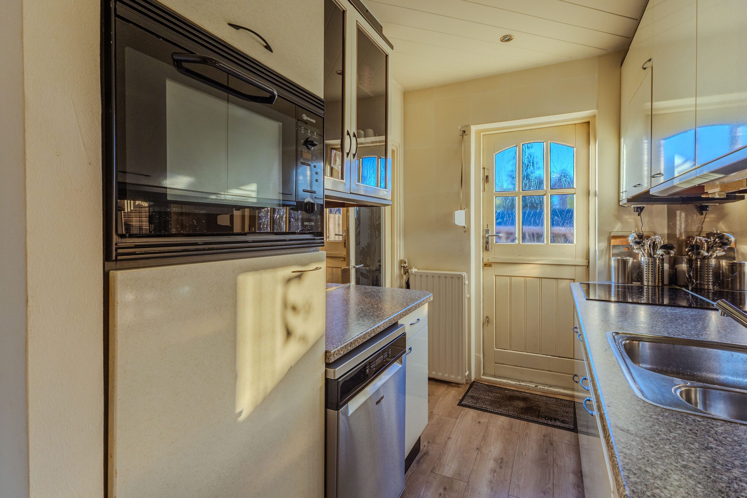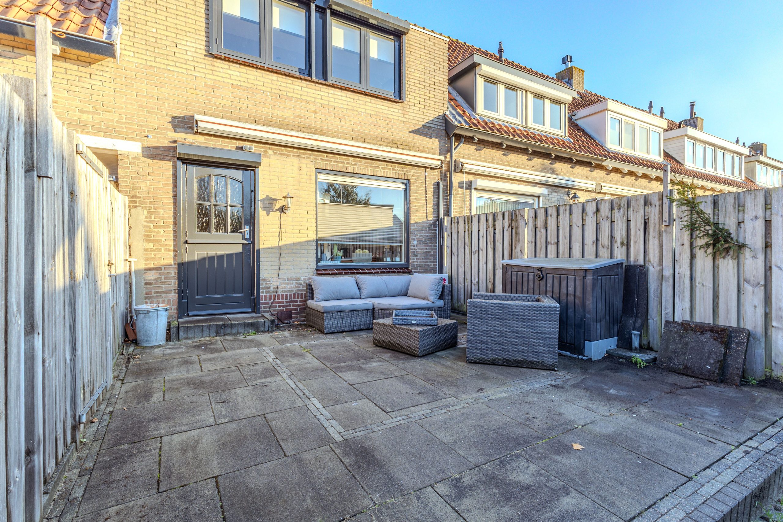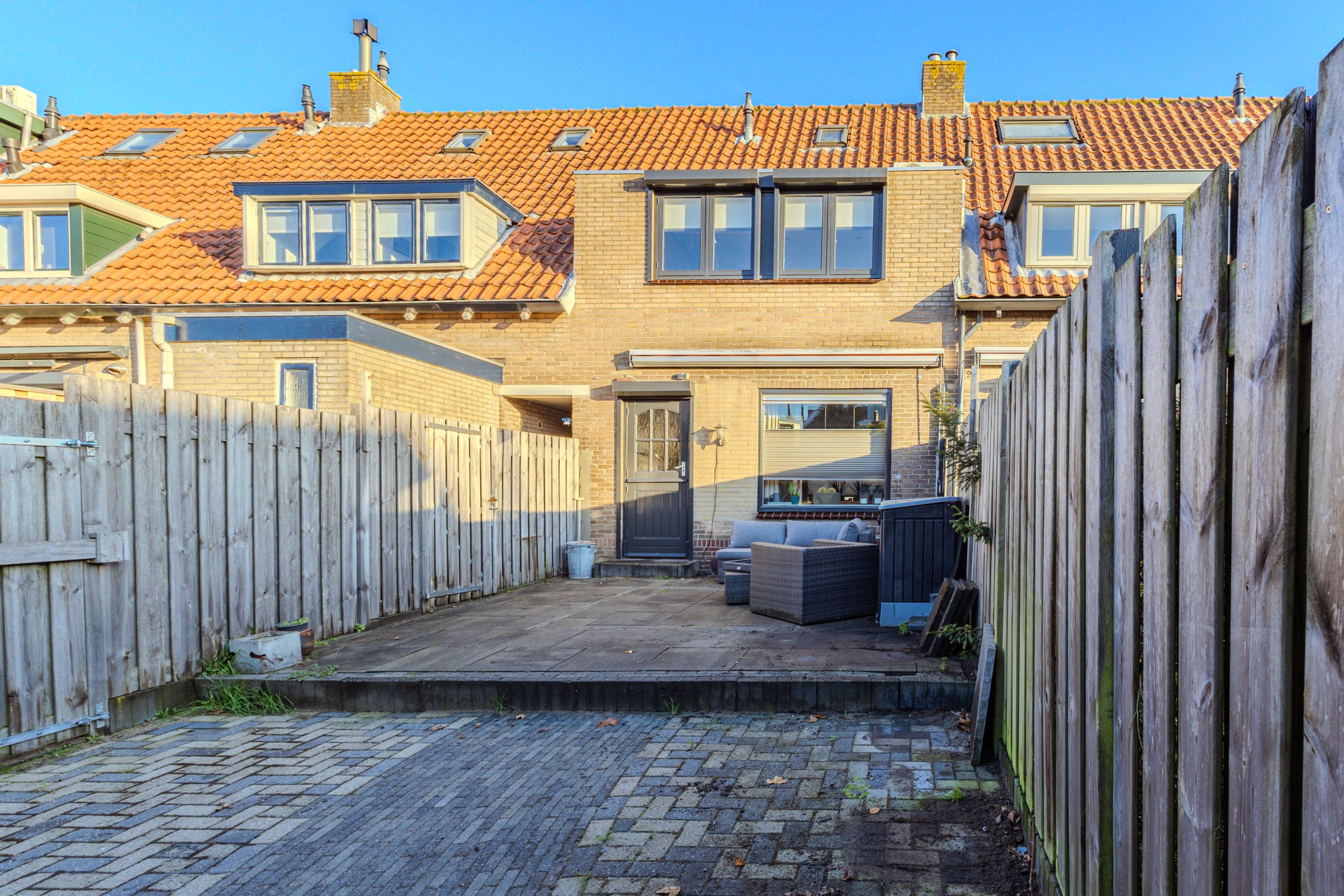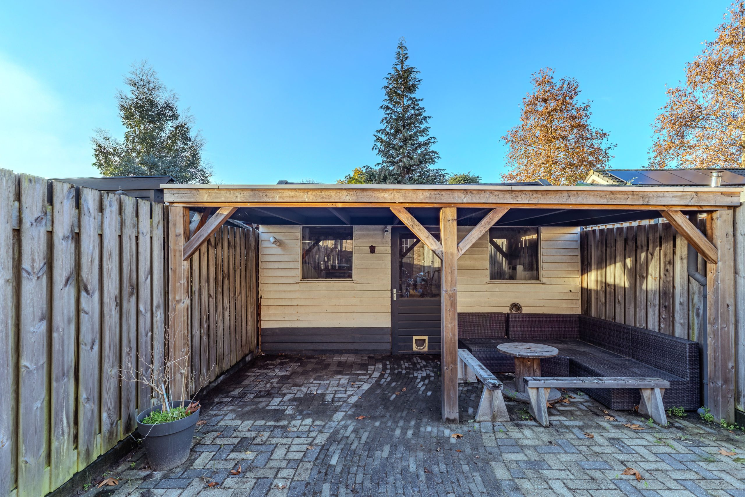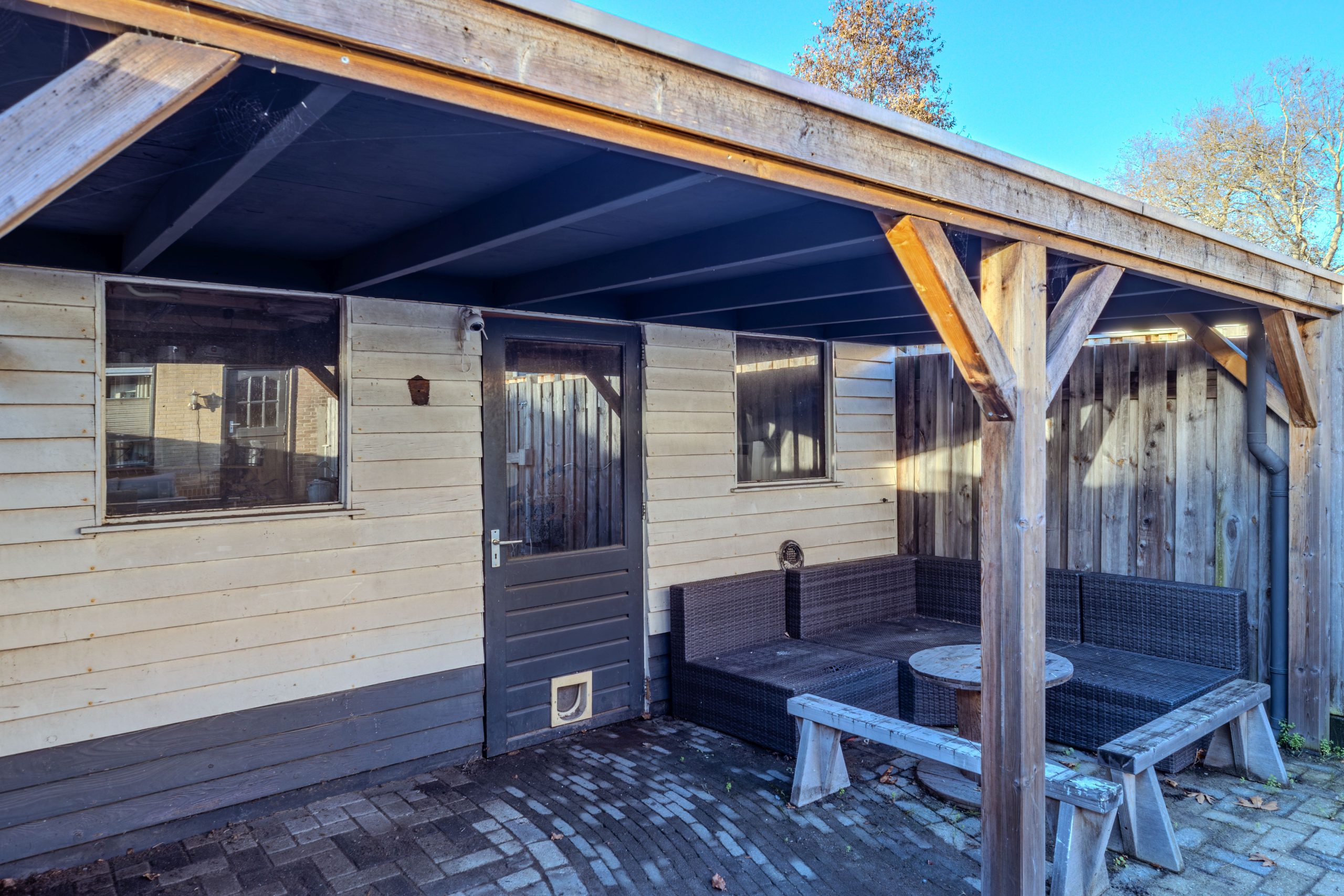 De heerlijk zonnige, op het westen gelegen achtertuin is ca. 13 meter diep en geheel voorzien van siertegels en -bestrating. Direct aan de achtergevel bevindt zich een zonnescherm en is er ruimte gecreëerd voor een comfortabele zithoek. De schutting aan de noordzijde is voorzien van twee poorten: een looppoort en een bredere poort, waardoor je bijvoorbeeld een motor eenvoudig in de tuin kunt plaatsen. Achterop het perceel is de houten berging gesitueerd, uitgerust met elektriciteit en een wateraansluiting. Hier vind je tevens de witgoedaansluitingen. In 2022 is aan deze berging een overkapping geplaatst, zodat je ook tijdens warme zomerdagen heerlijk in de schaduw kunt zitten.