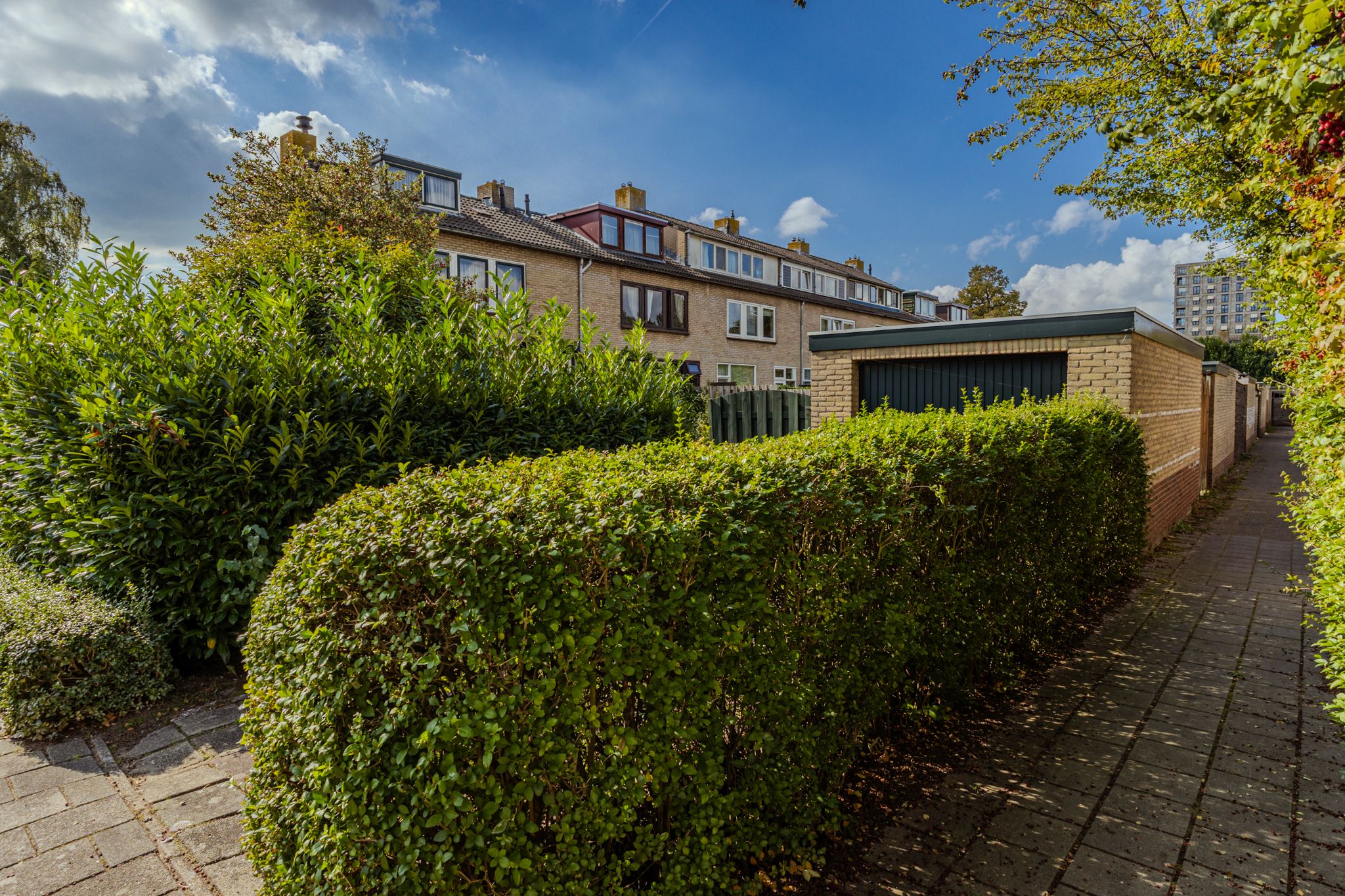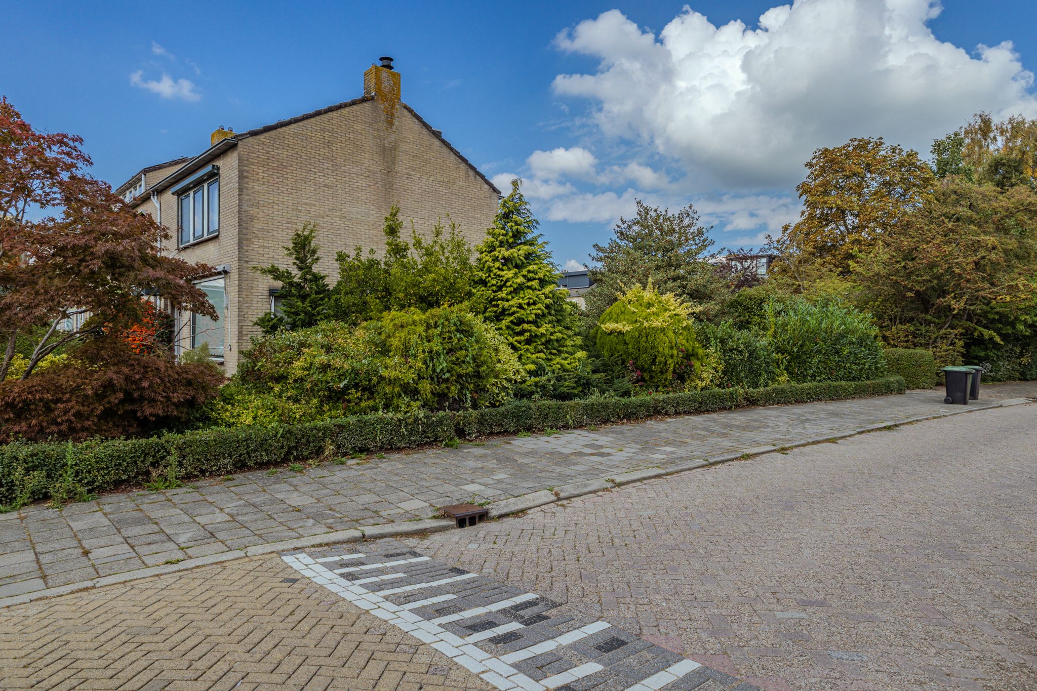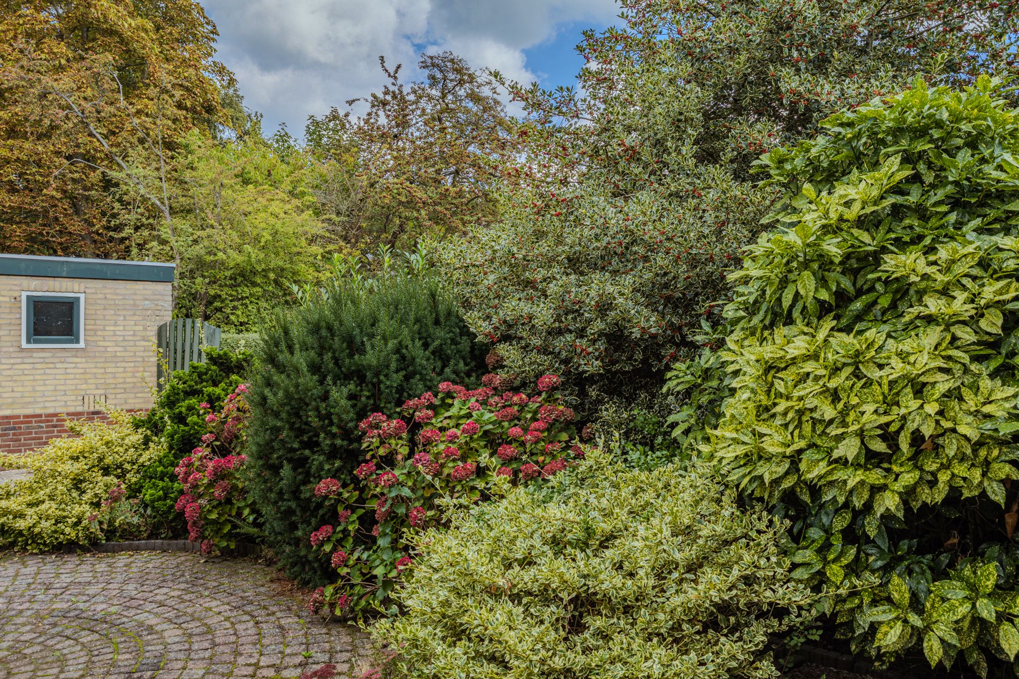 De woning en de garage cq. berging zijn gelegen op een royaal perceel welke grotendeels is voorzien van een grote diversiteit aan struiken, bomen en overige beplanting. De zonnige voortuin is ca. 6 meter diep, via een pad van grindtegels vindt de entree plaats tot de woning. Dit grindpad wordt verder omgeven door buxussen, struiken en heesters. Naast de woning bevindt zich een 6 meter brede zijtuin waar eveneens een grote diversiteit aan beplanting te vinden is. Ook de achtertuin (ca. 190 m²) is rijkelijk uitgerust met struiken en beplanting. Verder vind je hier een ruim betegeld zonneterras, sierbestrating en grindtegels. De garage cq. berging is te bereiken via de oprit welke vanuit de Nachtegaallaan toegankelijk is. Er is hier ruim plek voor het parkeren van een auto.