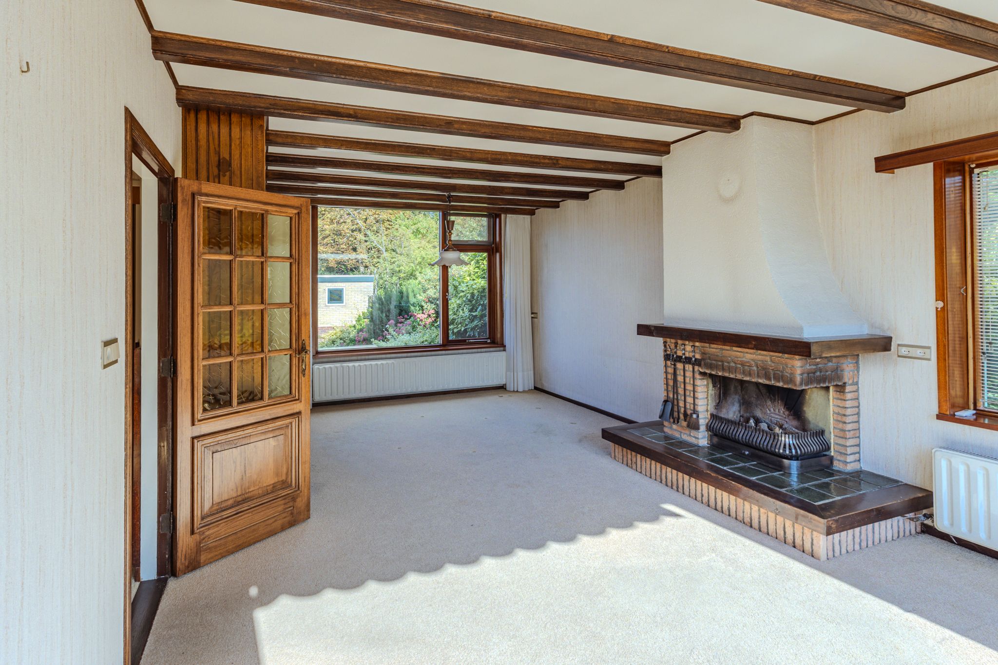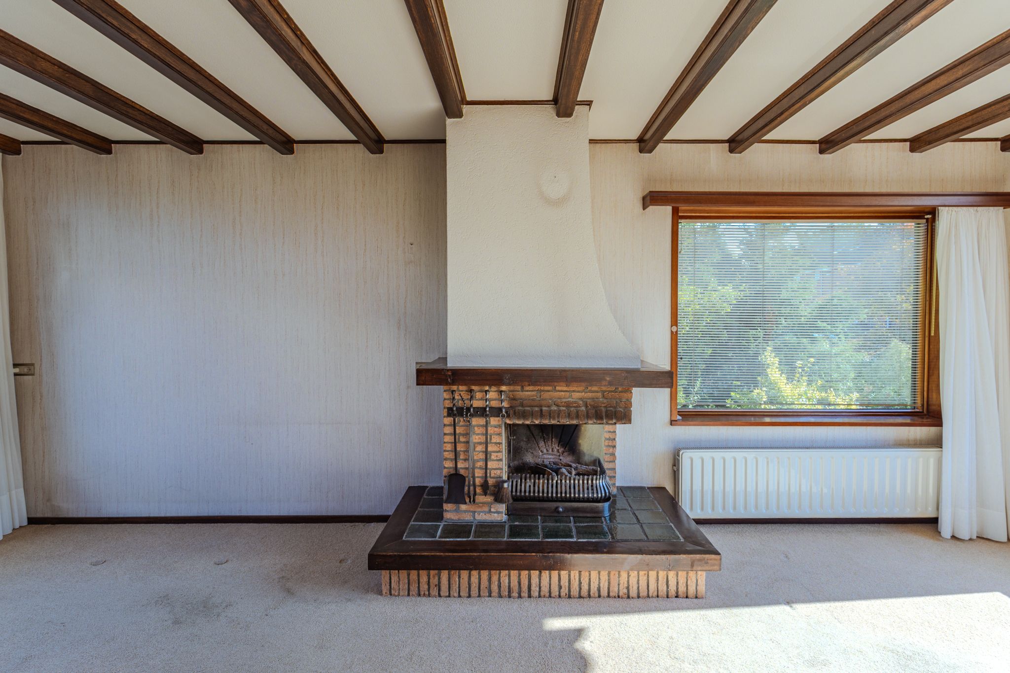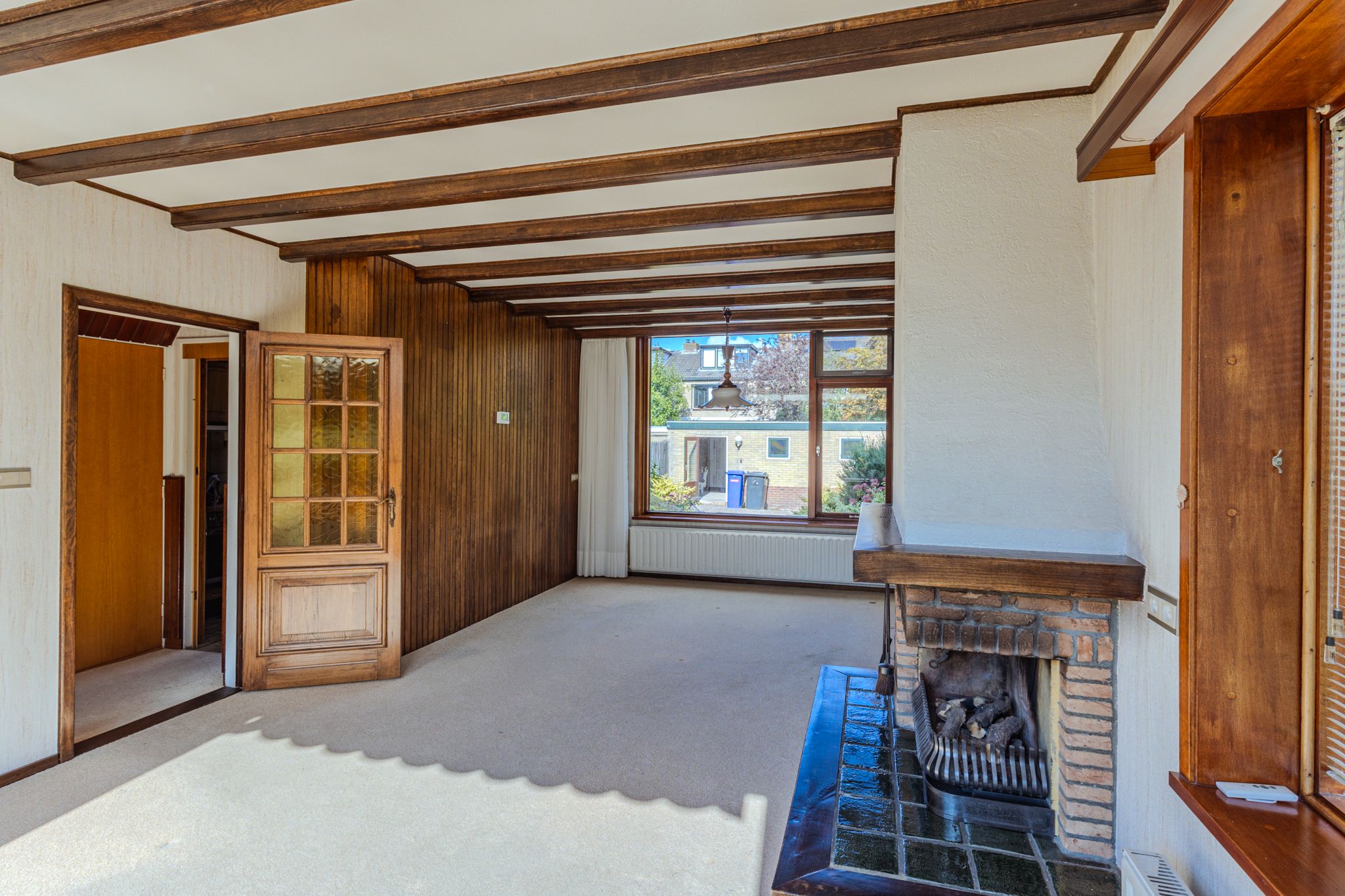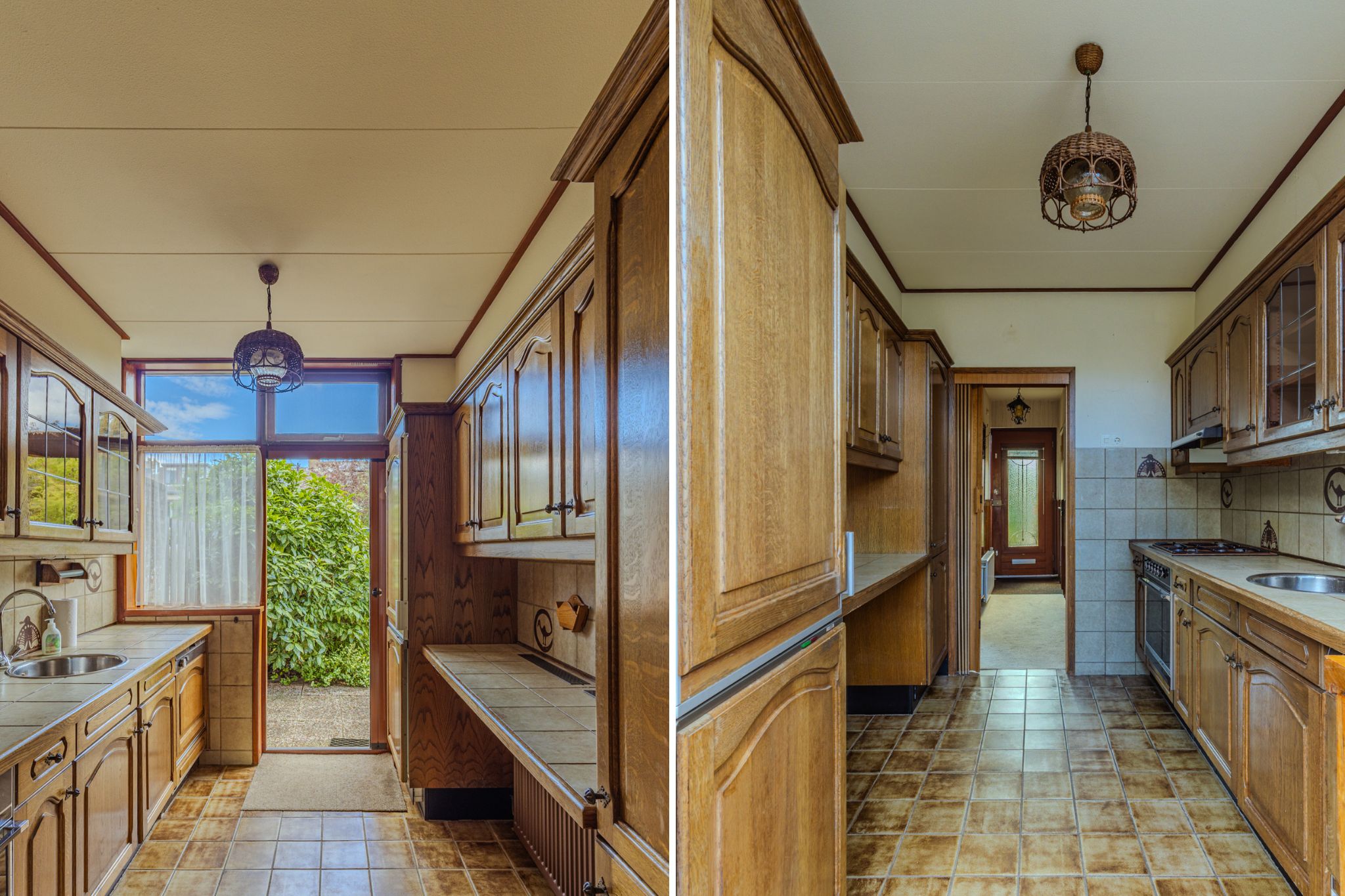 Via een overdekte entree toegang in de hal met de deels betegelde toiletruimte uitgerust met een toilet incl. stortbak en een fonteintje , de meterkast, de trapopgang en een trapkast. De doorzonwoonkamer met authentiek balkenplafond geniet dankzij de drie grote raampartijen van volop daglicht. Centraal in deze ruimte vind je een sfeervolle jaren ’60 gemetselde open haard met ingelegde tegels en een schoorsteenmantel. De ramen in de zij- en achtergevel zijn met elektrische rolluiken uitgerust. Het zuidelijk gelegen raam aan de voorzijde is voorzien van een zonnescherm. De robuuste eikenhouten keuken in parallelopstelling is ca. 50 jaar geleden geplaatst en is onder meer voorzien van een tegelwerk aanrechtblad en een mooie tegelwerk vloer. De inbouwapparatuur dateert eveneens uit die jaren. Vanuit de keuken toegang tot de achtertuin. De achtergevel is uitgerust met een elektrisch rolluik.