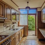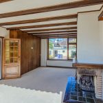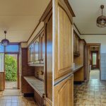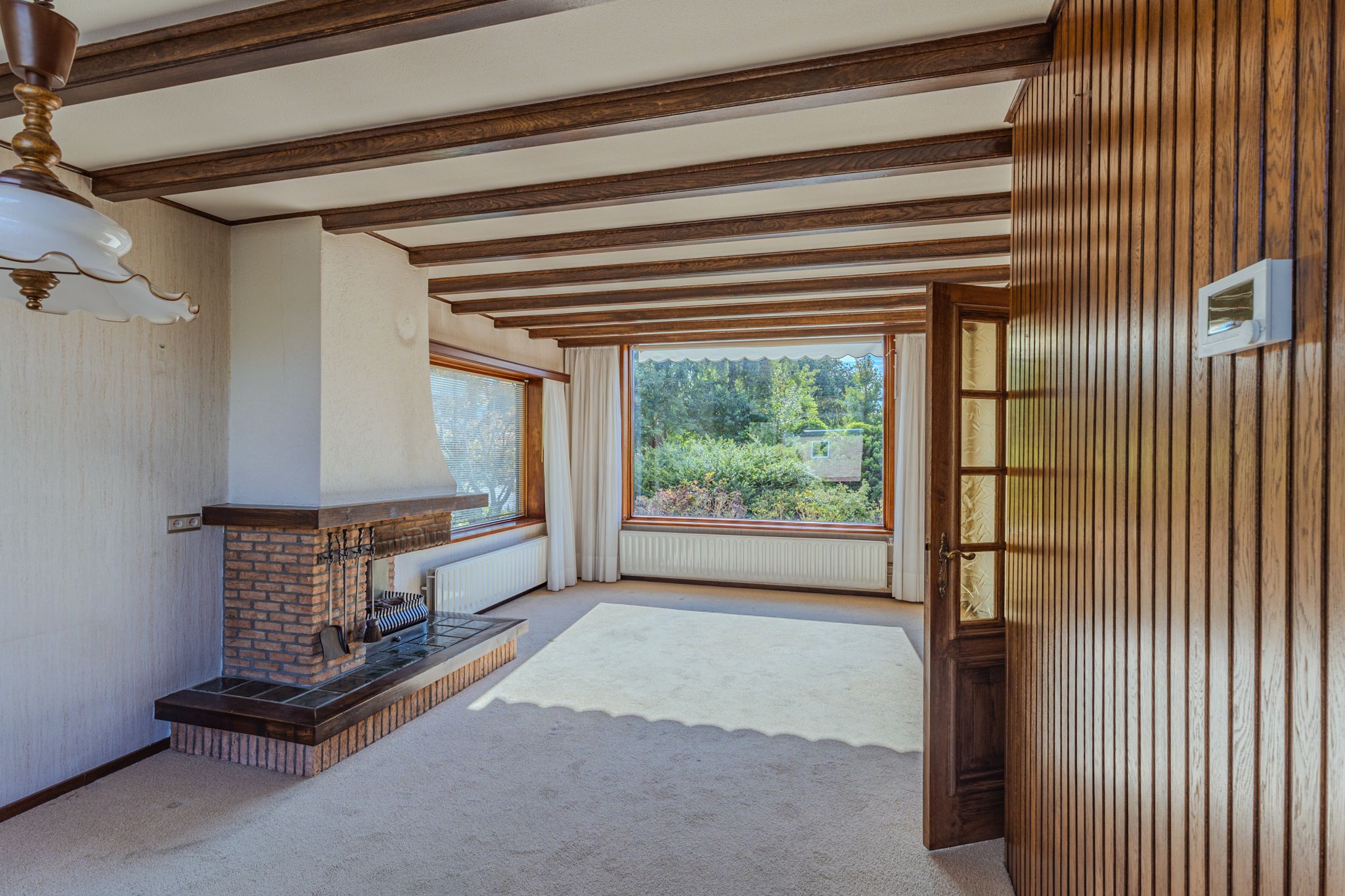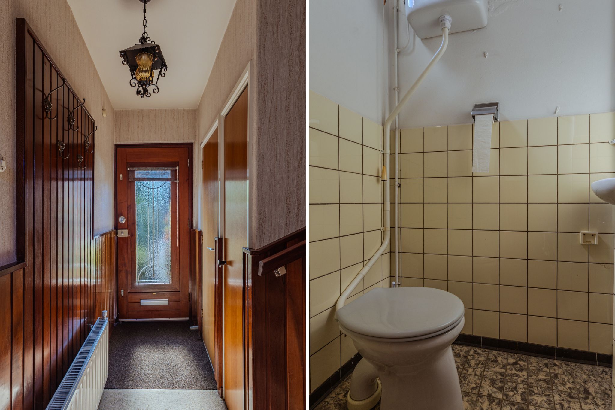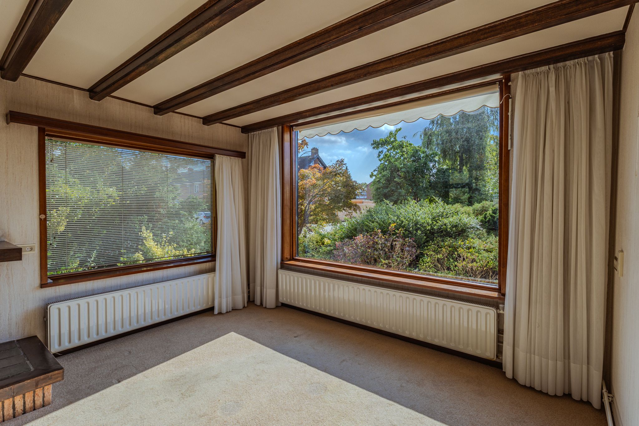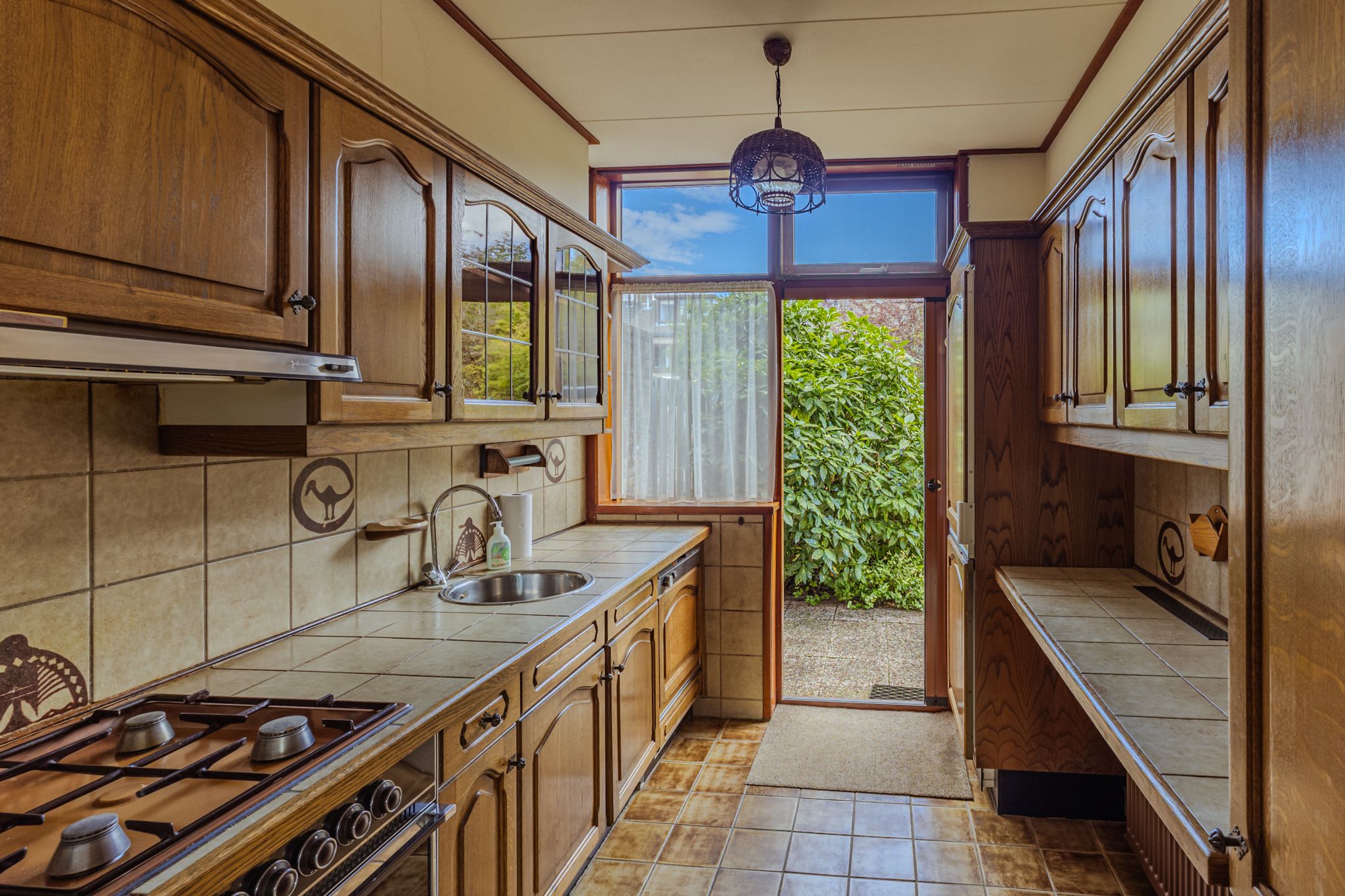 Via een overdekte entree toegang in de hal met de deels betegelde toiletruimte uitgerust met een toilet incl. stortbak en een fonteintje , de meterkast, de trapopgang en een trapkast. De doorzonwoonkamer met authentiek balkenplafond geniet dankzij de drie grote raampartijen van volop daglicht. Centraal in deze ruimte vind je een sfeervolle jaren ’60 gemetselde open haard met ingelegde tegels en een schoorsteenmantel. De ramen in de zij- en achtergevel zijn met elektrische rolluiken uitgerust. Het zuidelijk gelegen raam aan de voorzijde is voorzien van een zonnescherm. De robuuste eikenhouten keuken in parallelopstelling is ca. 50 jaar geleden geplaatst en is onder meer voorzien van een tegelwerk aanrechtblad en een mooie tegelwerk vloer. De inbouwapparatuur dateert eveneens uit die jaren. Vanuit de keuken toegang tot de achtertuin. De achtergevel is uitgerust met een elektrisch rolluik.