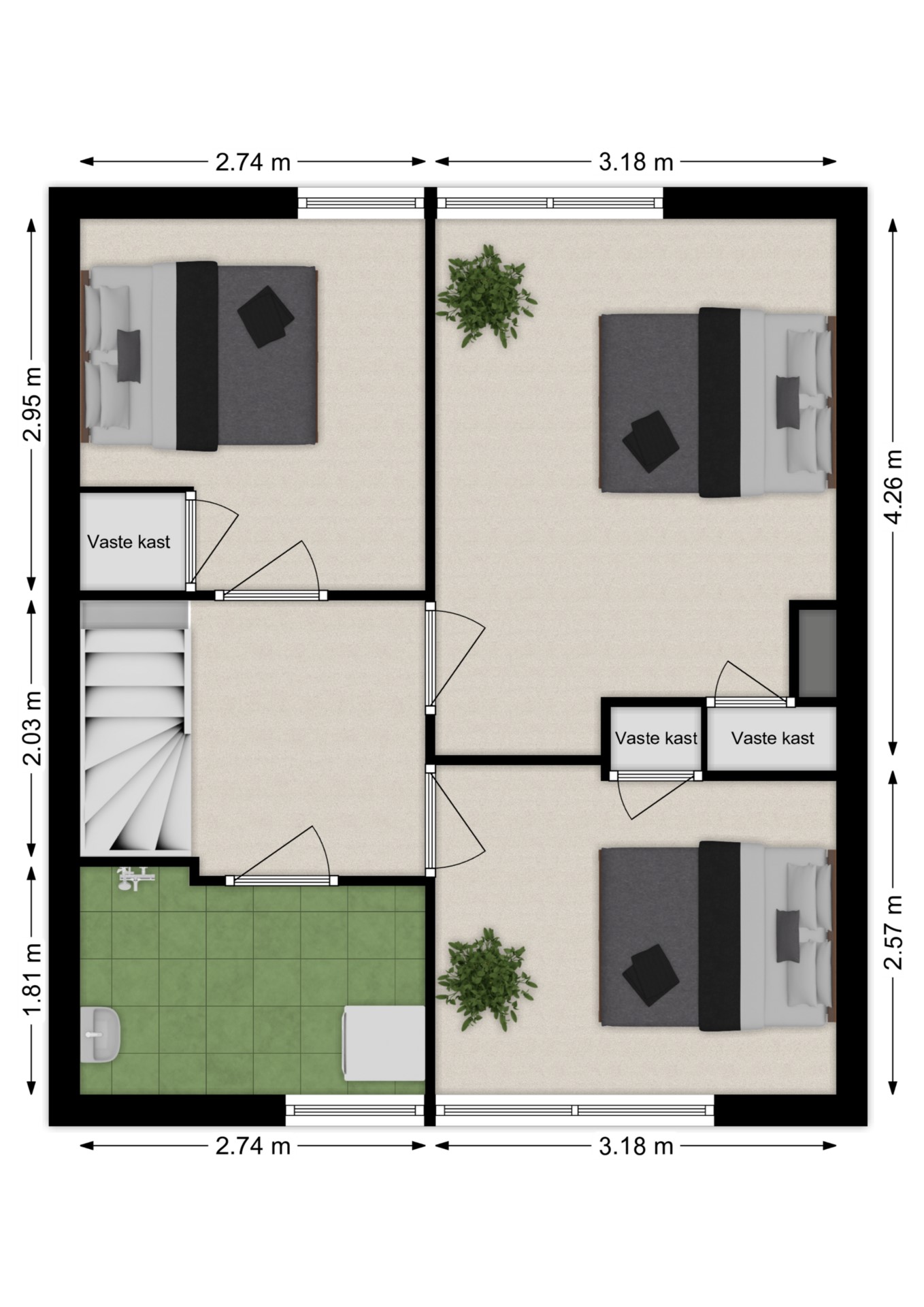 De ruime overloop biedt toegang tot drie ruime slaapkamers, de badkamer en de trapopgang. De 1ste slaapkamer is aan de achterzijde gelegen en voorzien van een ruime vaste kast. Het raam in deze kamer is uitgerust met een hor. Ook de 2de slaapkamer vind je aan de achterzijde en is eveneens uitgerust met een vaste kast en horren voor de openslaande ramen. De derde ruime slaapkamer ligt aan de straatzijde. Naast de vaste inbouwkast en horren zijn de ramen hier uitgerust met een elektrisch bedienbaar rolluik. De ruime en nette badkamer is geheel voorzien van origineel jaren ’60-’70 tegelwerk. Je vindt hier naast de douchegelegenheid en wastafel tevens de wasmachine aansluiting.