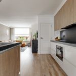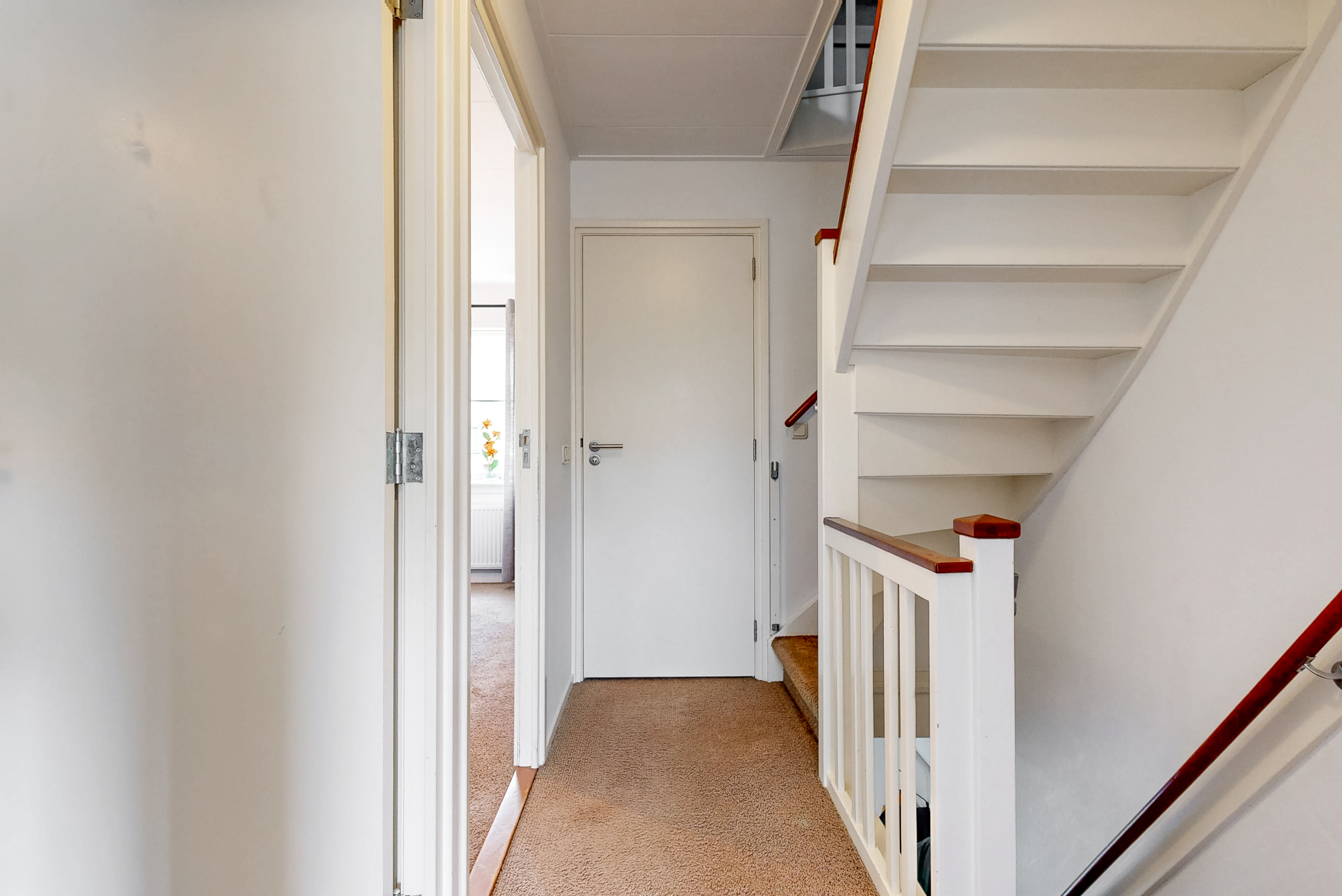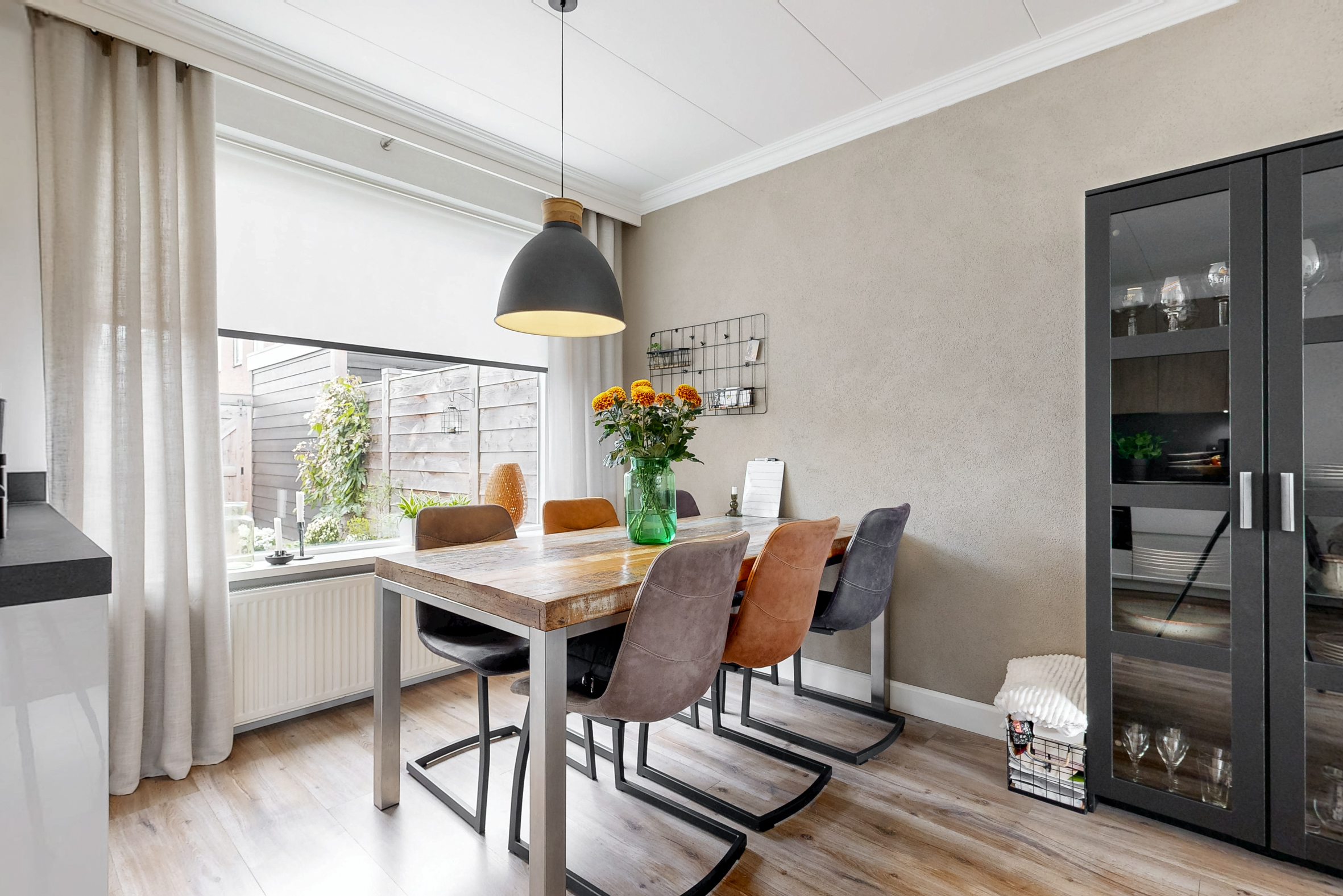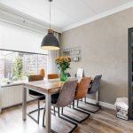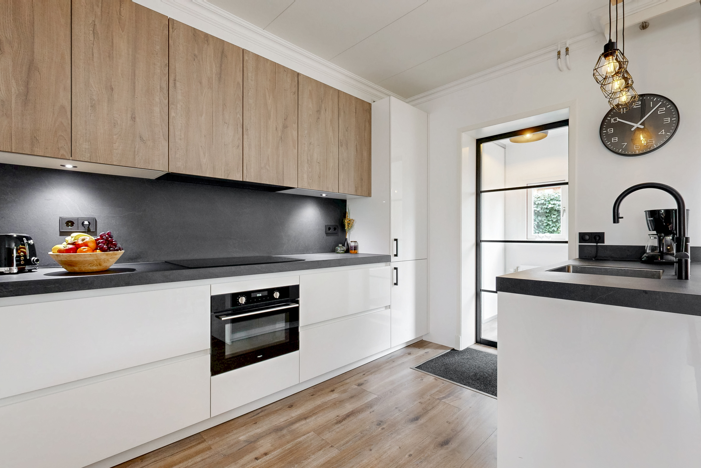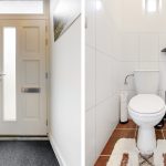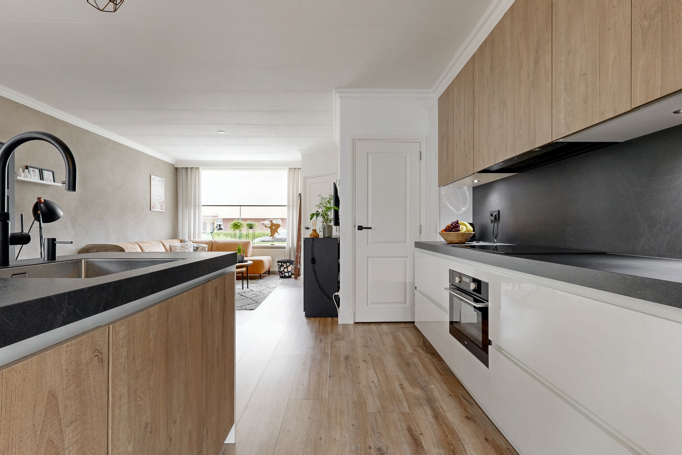 Entree in de hal met de deels betegelde toiletruimte, garderoberuimte, trapopgang en de meterkast. De doorzonwoonkamer is opgedeeld in een zitgedeelte aan de straatzijde en een eetgedeelte nabij de open keuken aan de tuinzijde. De hoge raampartijen zorgen voor een prettig lichtinval. De moderne open keuken met spoeleiland is in 2021 geplaatst en voorzien van alle denkbare gemakken. Zo vind je hier een vaatwasser, inductiekookplaat, combi-oven, Quooker en koelkast. Vanuit hier toegang tot de praktische trap- / kelderkast – ideaal voor proviand en opslag. Ook de bijkeuken is in 2021 aangebouwd en biedt naast de toegang tot de achtertuin een vaste kastenwand.