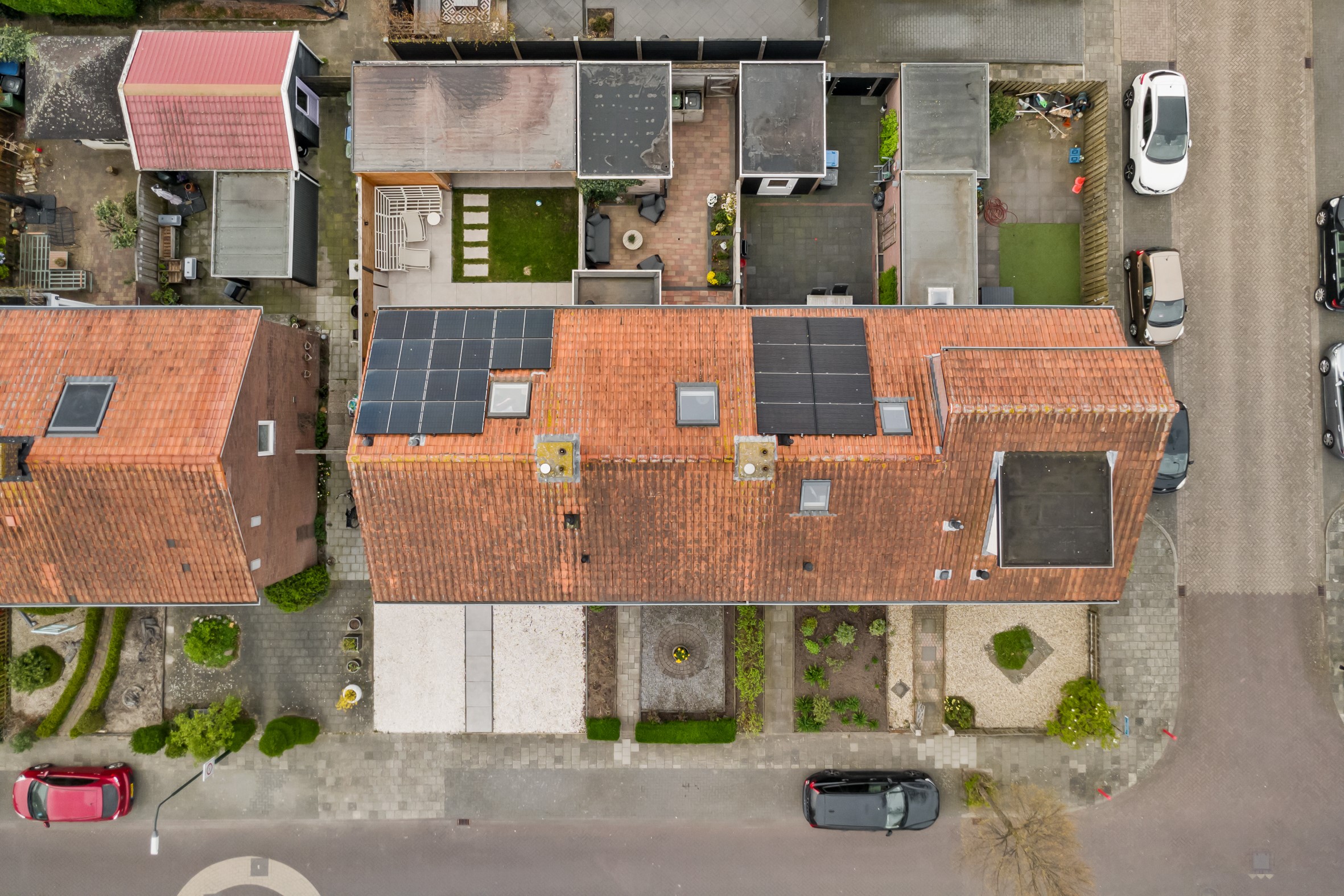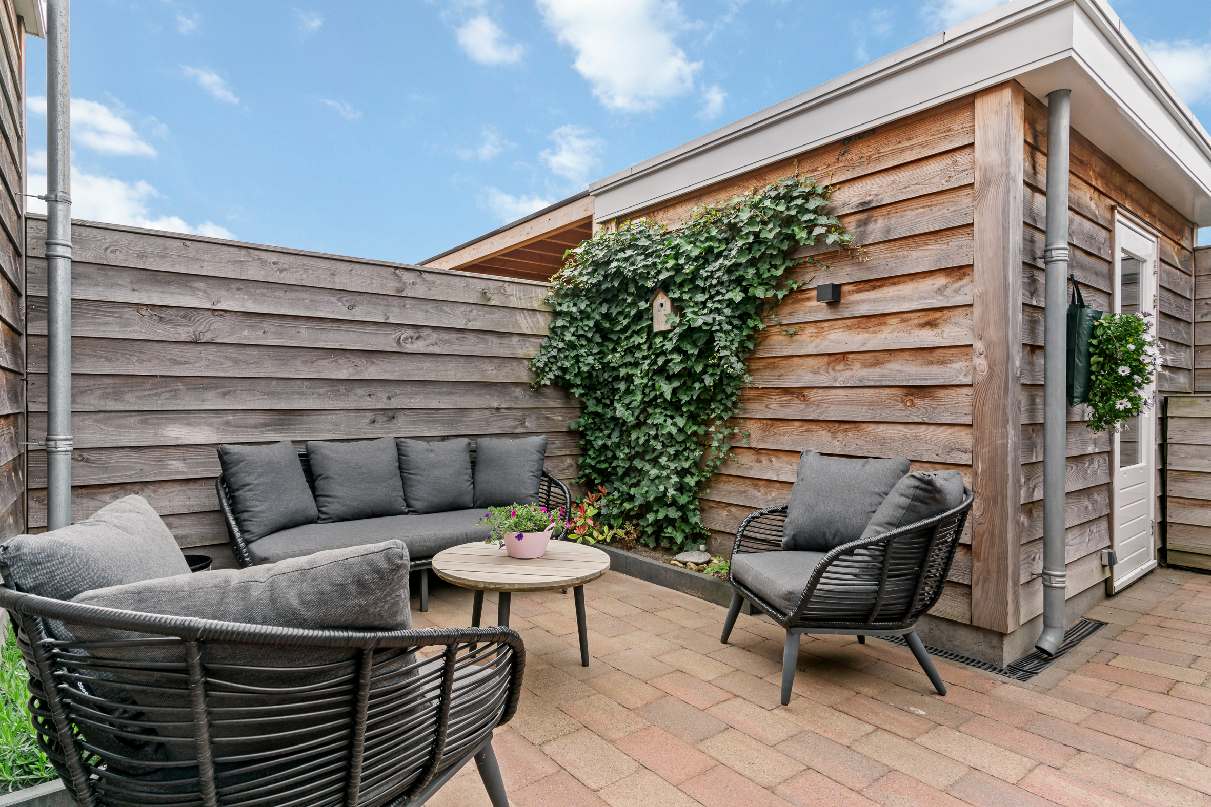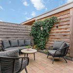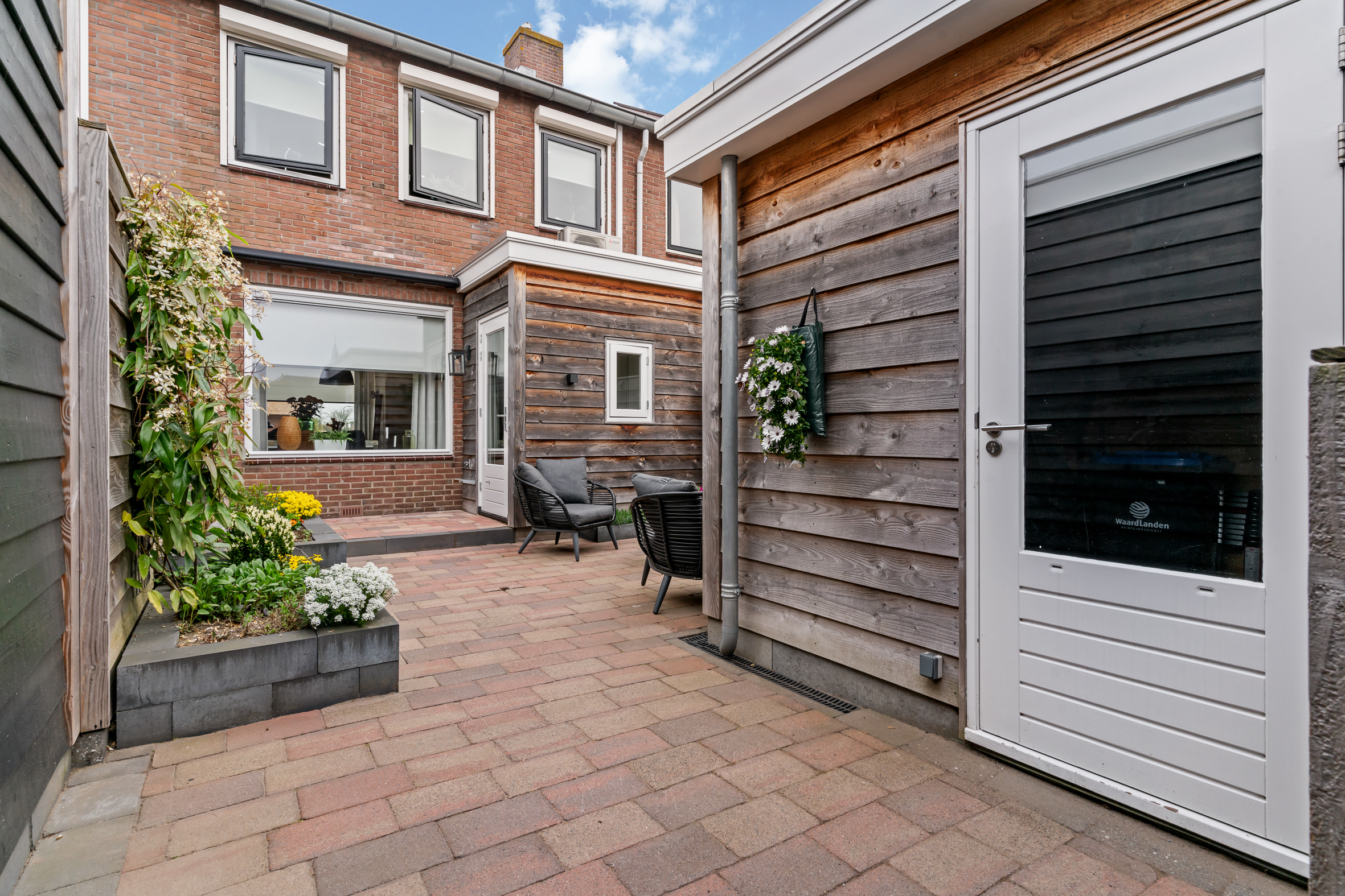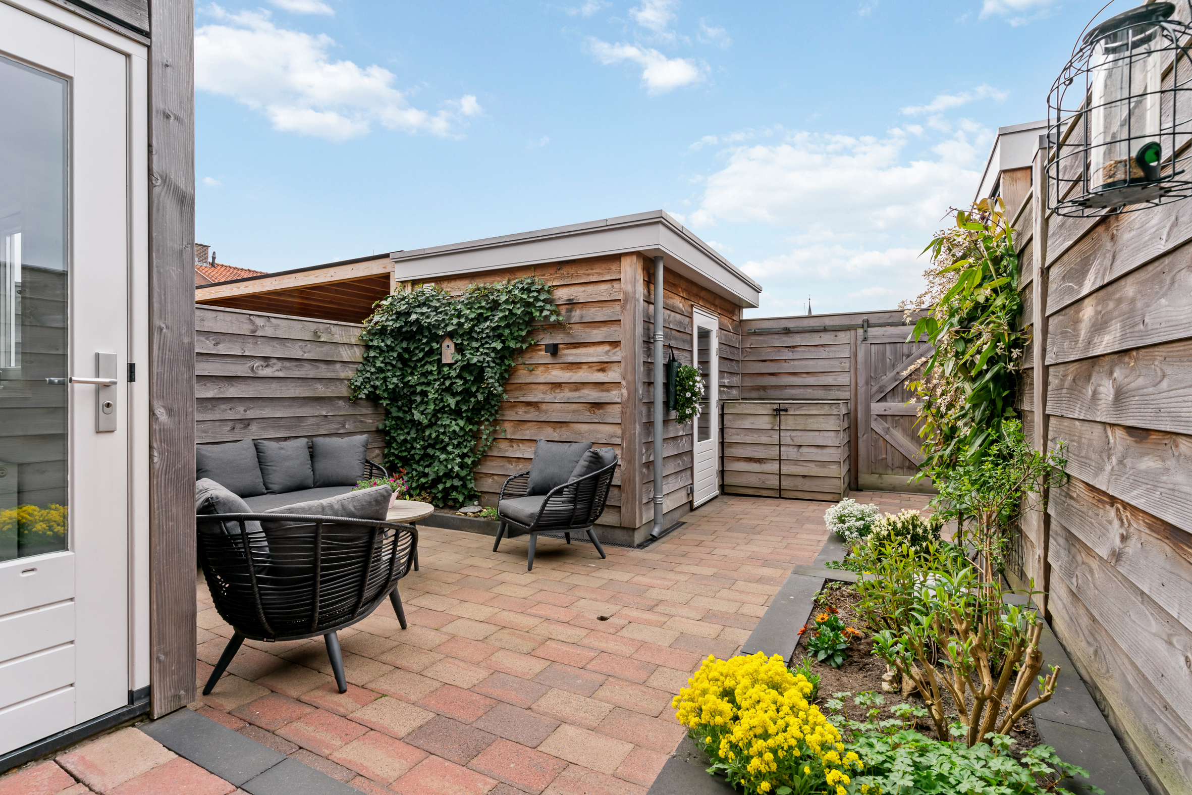 Door de zuidelijke ligging geniet de keurige en in 2021 aangelegde achtertuin de hele dag van optimale zon waar door het elektrische zonnescherm ook een schaduwrijke plek eenvoudig te creëren is. De tuin is grotendeels voorzien van sierbestrating en biedt meerdere plantenborders. Zowel de aanbouw als de schuur, welke ook in 2021 is geplaatst, zijn deels bekleed met luxe en weerbestendig red ceder. Via een barndeur toegang tot de achtergelegen brandgang.