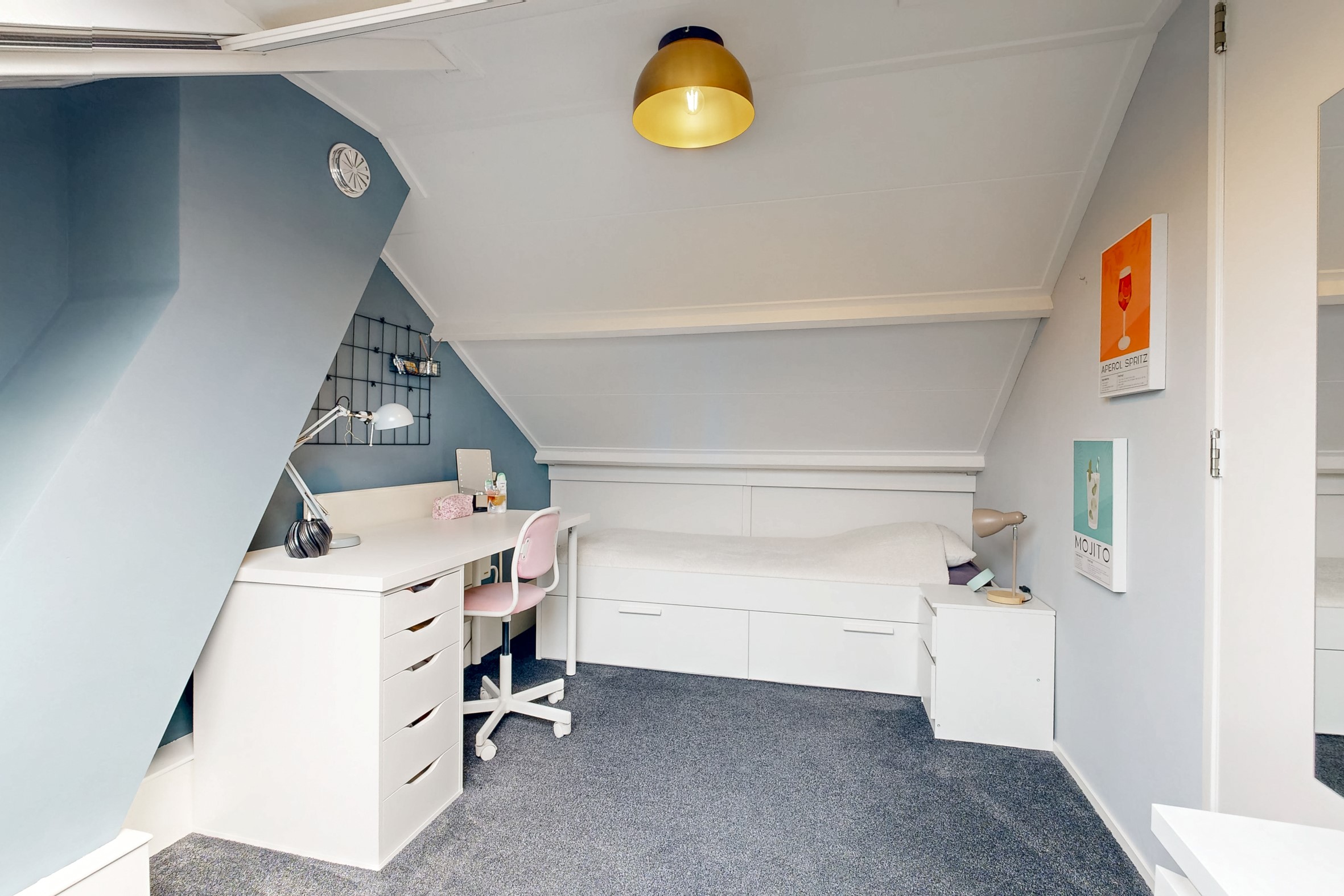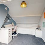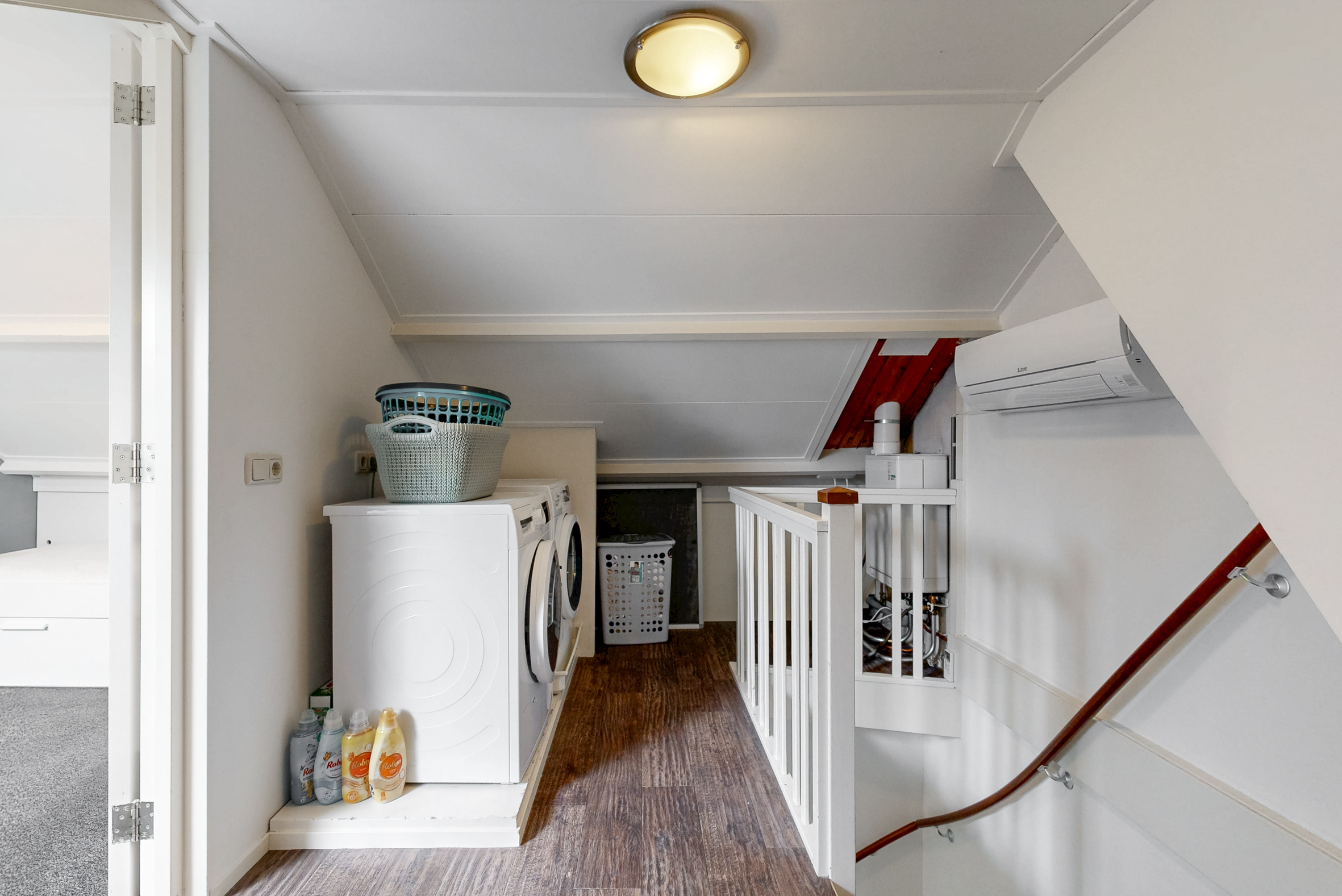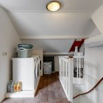 Voorzolder met de witgoedaansluitingen, de CV-installatie (2021), een airconditioning-unit en bergruimte achter de knieschotten. Op deze etage vind je de vierde slaapkamer met Velux-dakraam.