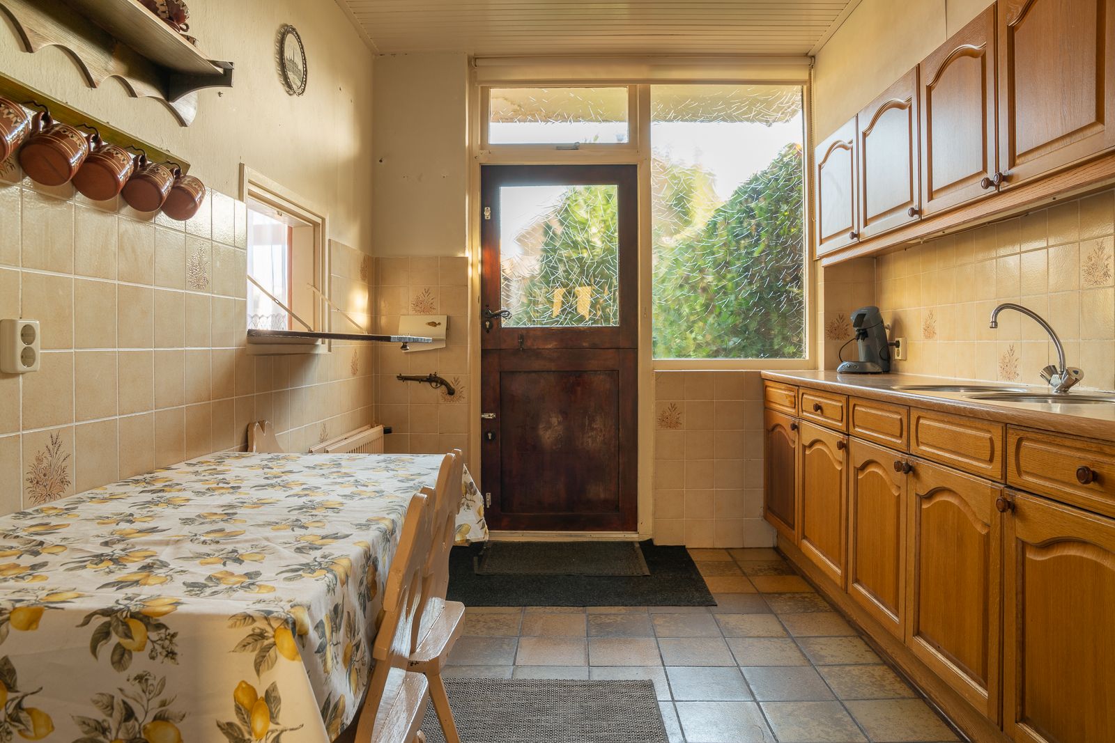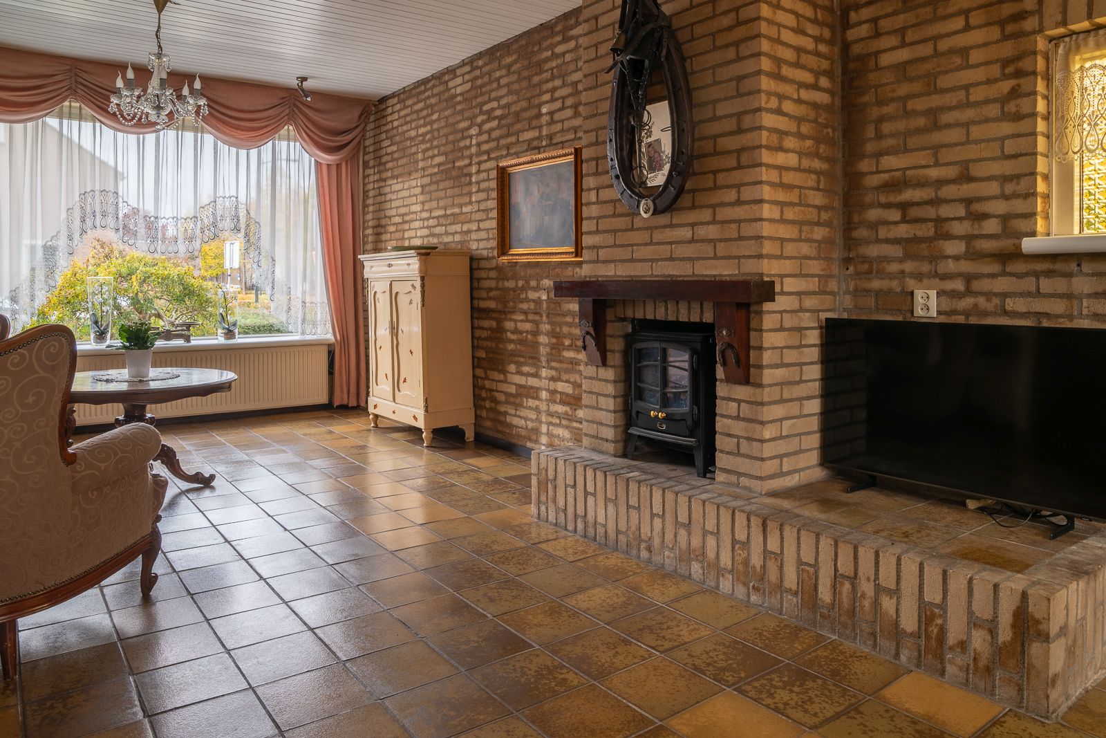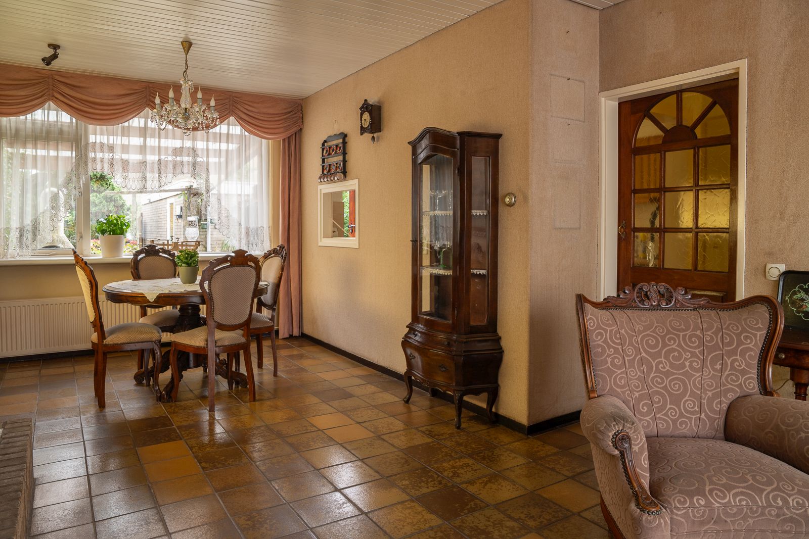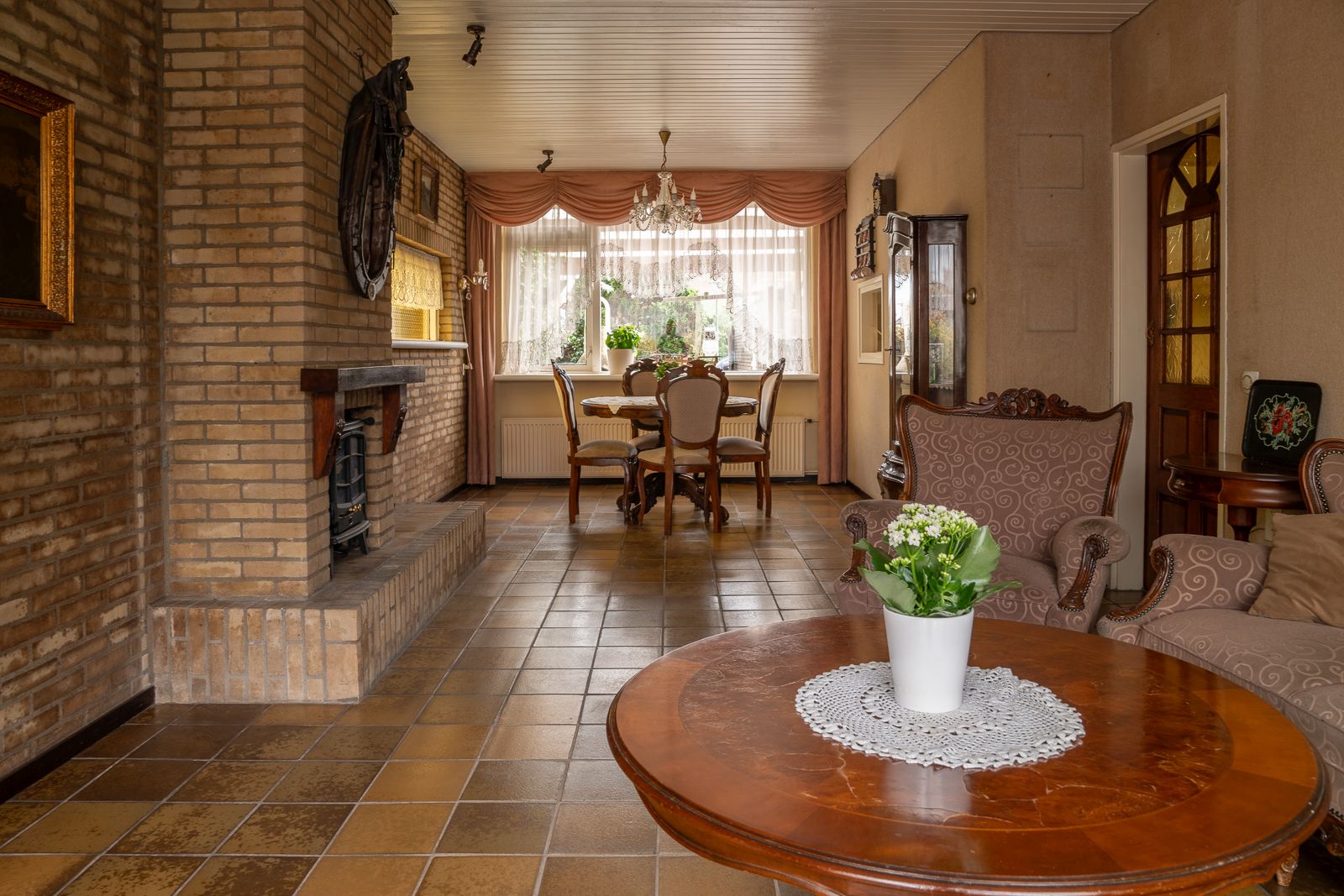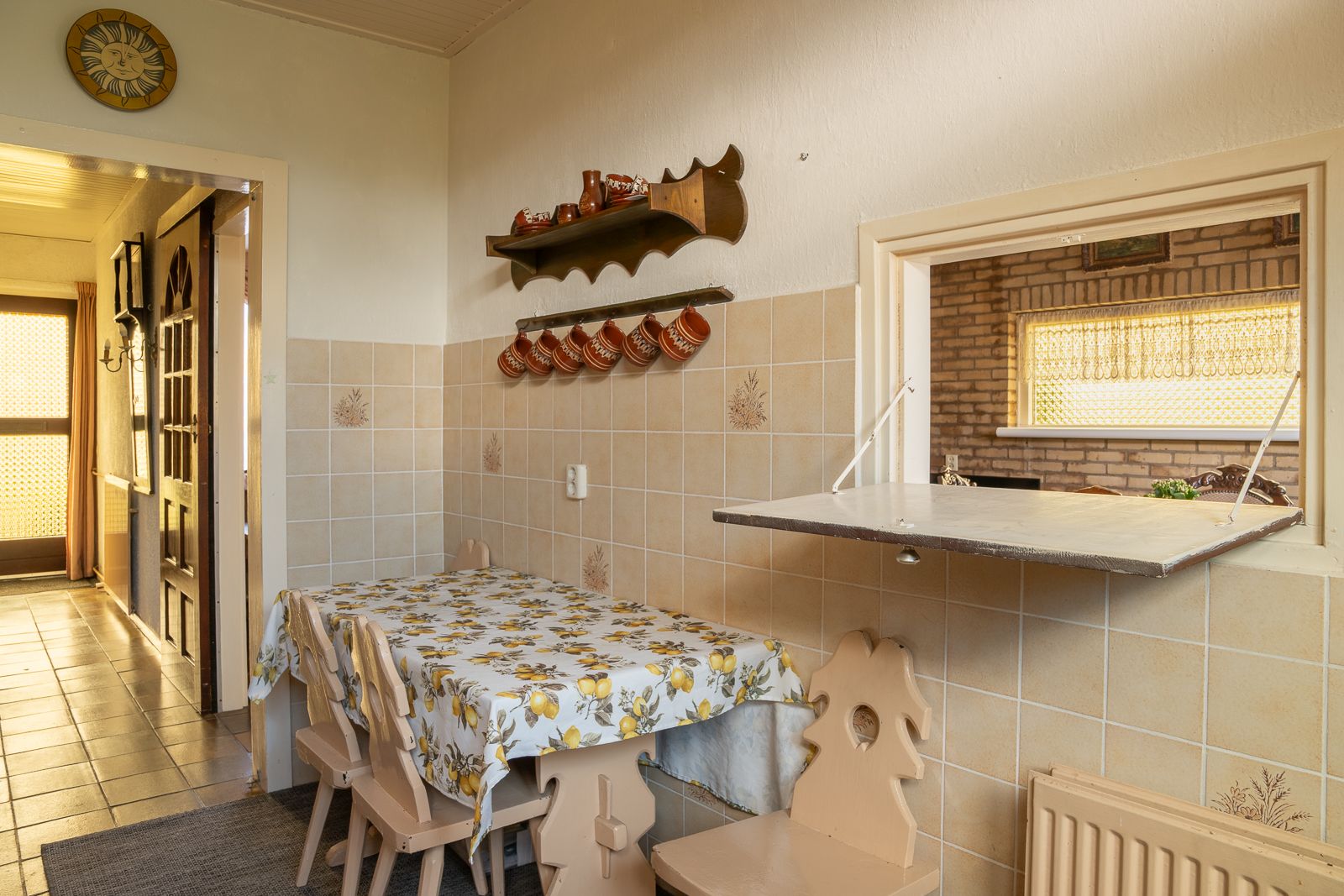 Overdekte entree in de hal voorzien van de nette toiletruimte voorzien van een staand toilet en een fonteintje, de meterkast, de trapopgang en een ruime trapkast. Vanuit de hal toegang tot zowel de woonkamer als de keuken. De doorzonwoonkamer is opgedeeld in een zitgedeelte dat zich bevindt bij de raampartij met zonnescherm. Het eetgedeelte is gericht op de raampartij aan de achterzijde en is uitgerust met een eigentijds en functioneel doorgeefluik naar de keuken. De eveneens karakteristieke jaren’70 schouw vormt een natuurlijke overgang tussen beide ruimtes. De ruime gesloten keuken biedt volop mogelijkheden. De keukenopstelling dateert uit 1992 maar is robuust gebouwd en voorzien van onder meer een gasfornuis, oven en koelkast. Vanuit de keuken is er directe toegang tot de achtertuin.