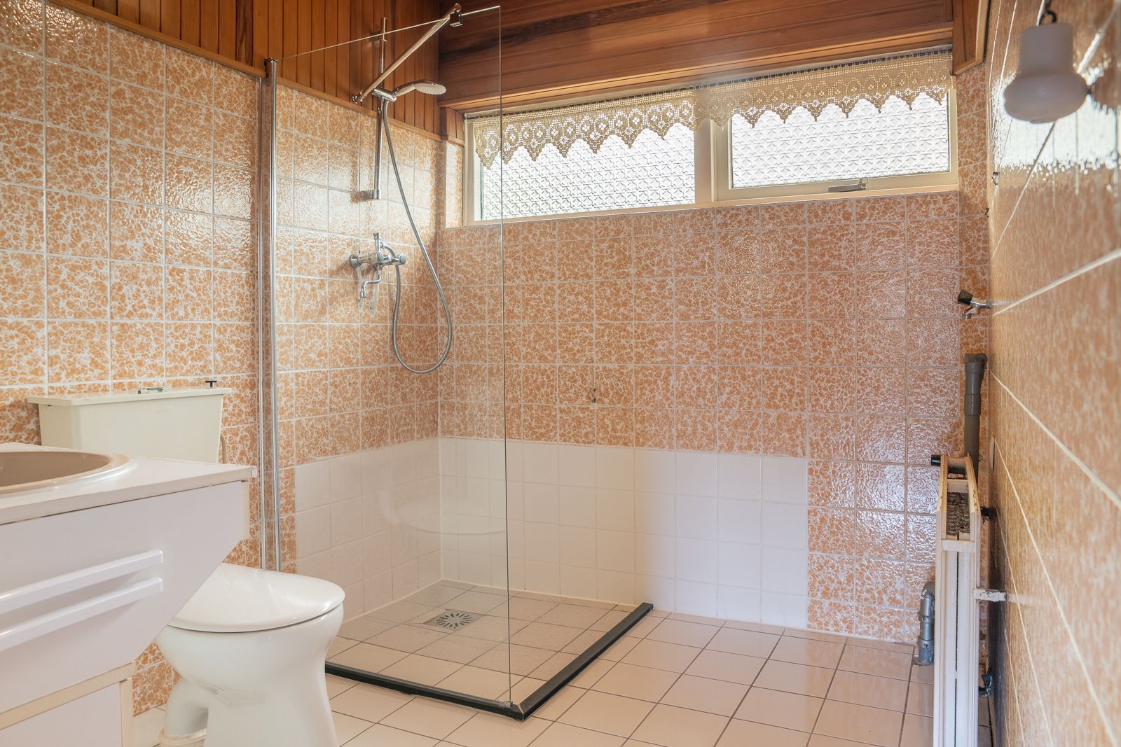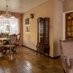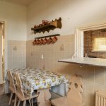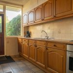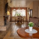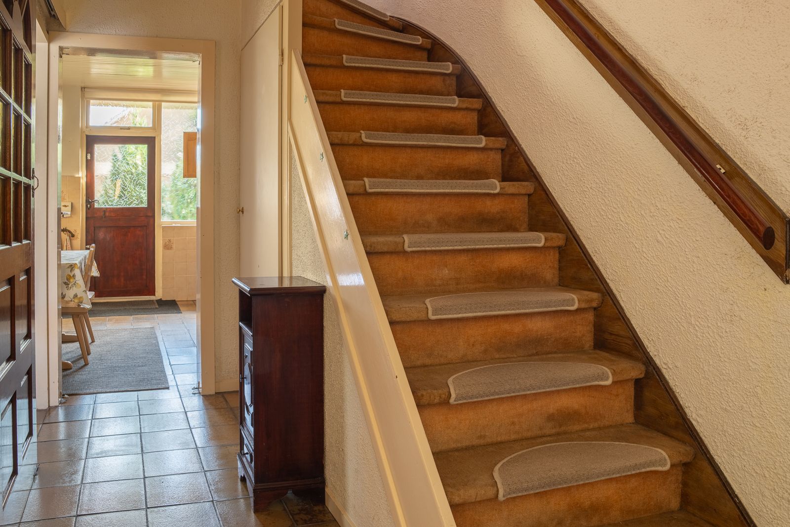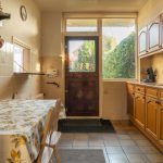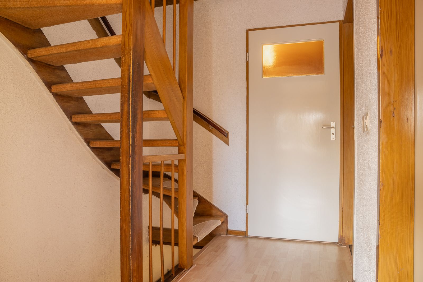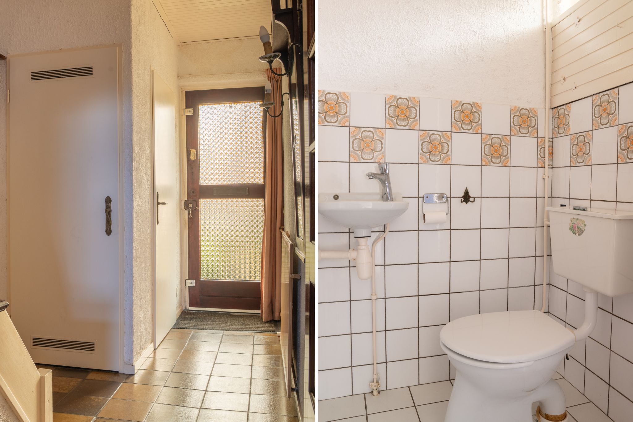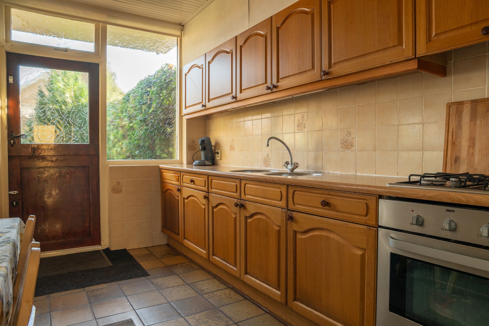 Overdekte entree in de hal voorzien van de nette toiletruimte voorzien van een staand toilet en een fonteintje, de meterkast, de trapopgang en een ruime trapkast. Vanuit de hal toegang tot zowel de woonkamer als de keuken. De doorzonwoonkamer is opgedeeld in een zitgedeelte dat zich bevindt bij de raampartij met zonnescherm. Het eetgedeelte is gericht op de raampartij aan de achterzijde en is uitgerust met een eigentijds en functioneel doorgeefluik naar de keuken. De eveneens karakteristieke jaren’70 schouw vormt een natuurlijke overgang tussen beide ruimtes. De ruime gesloten keuken biedt volop mogelijkheden. De keukenopstelling dateert uit 1992 maar is robuust gebouwd en voorzien van onder meer een gasfornuis, oven en koelkast. Vanuit de keuken is er directe toegang tot de achtertuin.