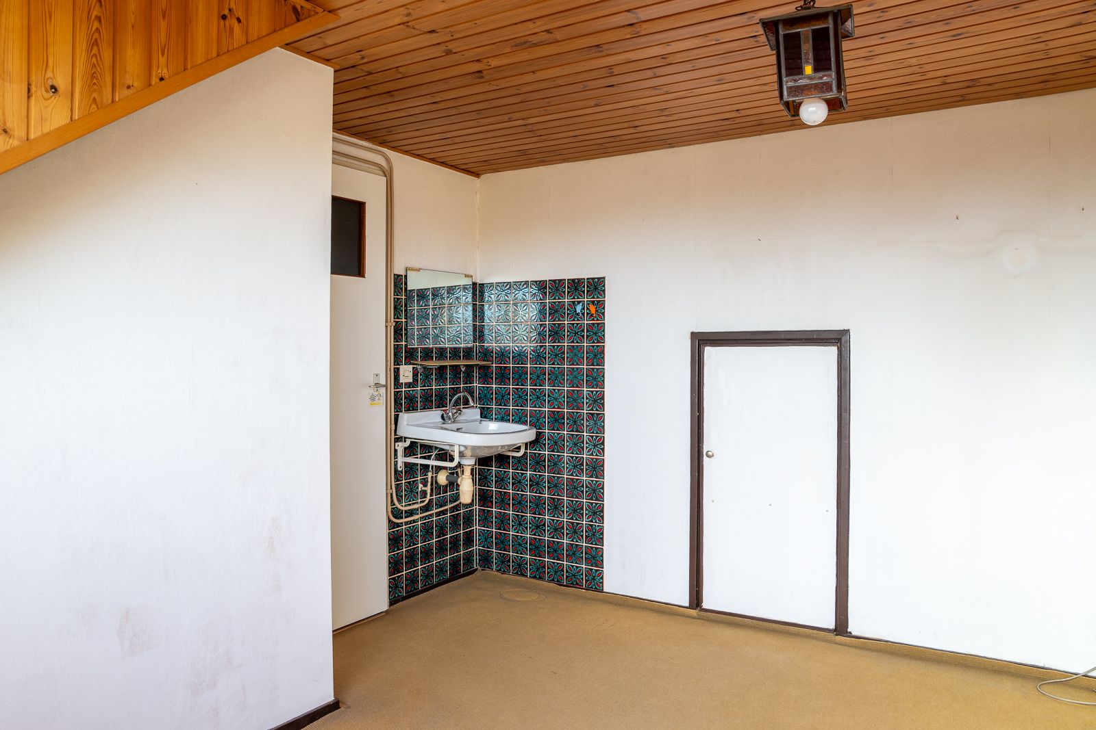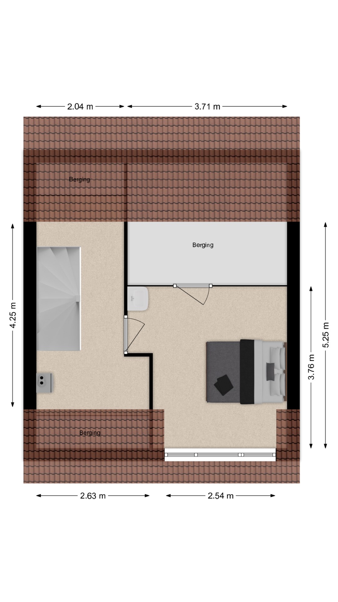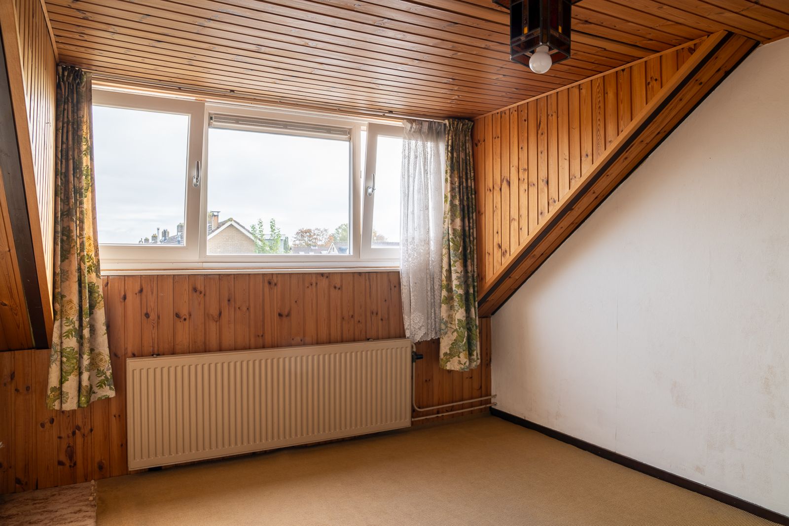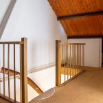 Ruime voorzolder met de CV-installatie en bergruimte achter de knieschotten. De vierde slaapkamer is uitgerust met een dakkapel, een wastafel en een riante bergkamer.