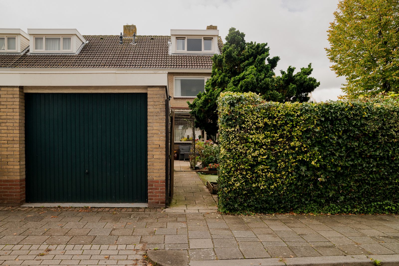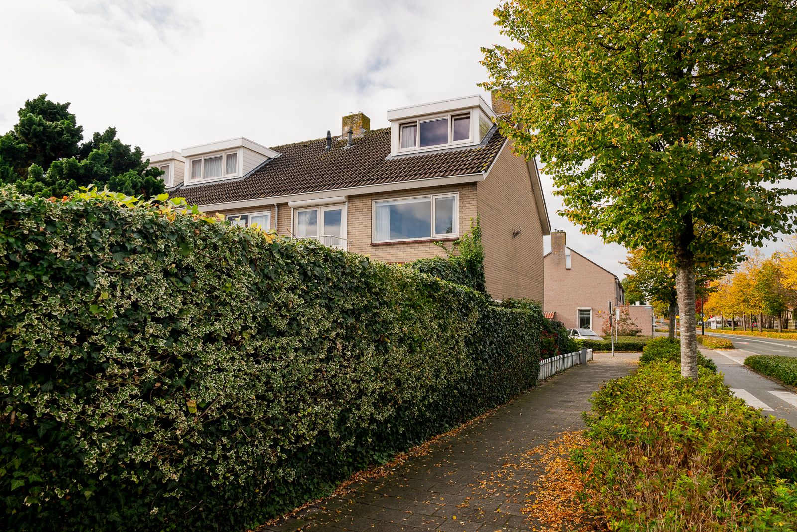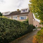 De ca. 3,5 meter diepe voortuin is voorzien van een sierhek welke doorloopt langs de zijde van de woning. Hier vind je diverse vaste beplanting, heggen en struiken afgewisseld met grind en siertegels. Een pad leidt naar de overdekte entree van de woning.