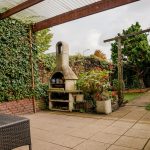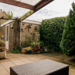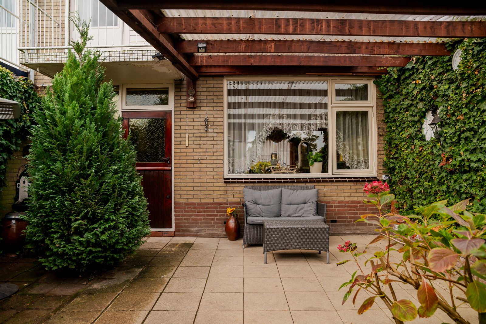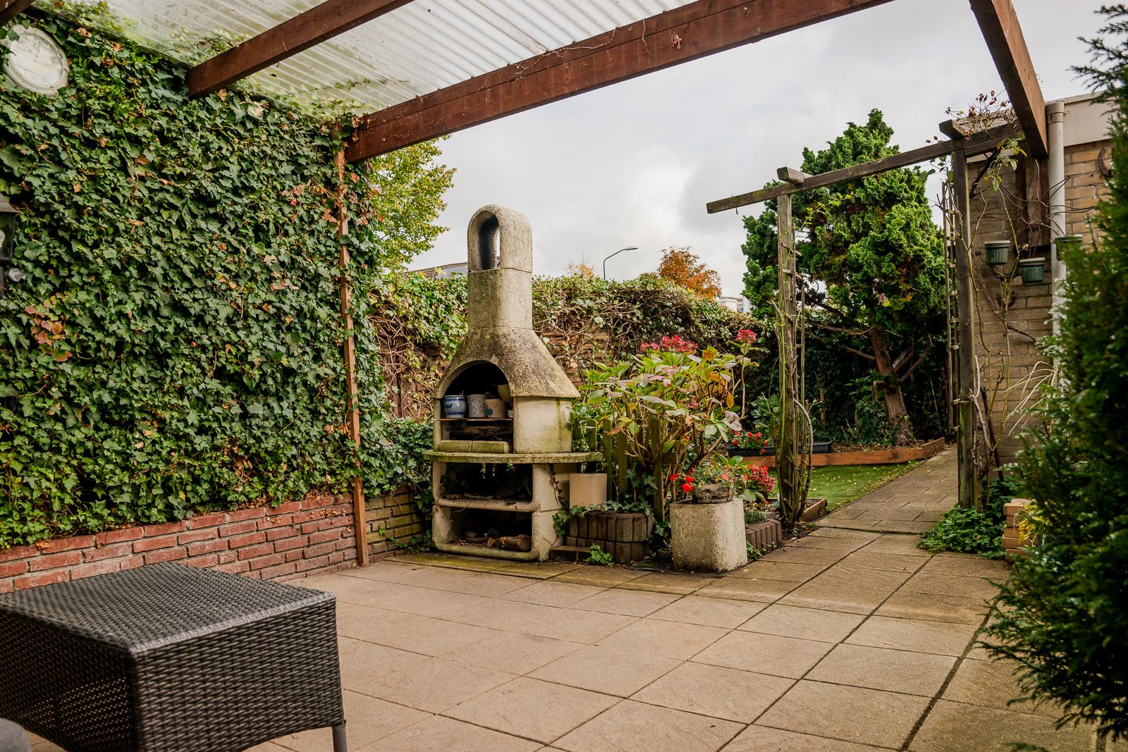 De op het oosten gelegen achtertuin is een heerlijke, besloten buitenruimte uitgerust met een overkapping direct aan de gevel. Ideaal om ook bij minder weer buiten te zitten. De tuin is aangelegd met sierbestrating, enkele plantenborders en kunstgras. Ook de stenen barbecue blijft hier achter. Rondom zorgt een mooie haag voor optimale privacy. Vanuit de tuin is er via een loopdeur toegang tot de garage welke door de handmatige garagedeur geschikt is om een auto te parkeren, voor hobby’s of om extra opslagruimte te creëren.