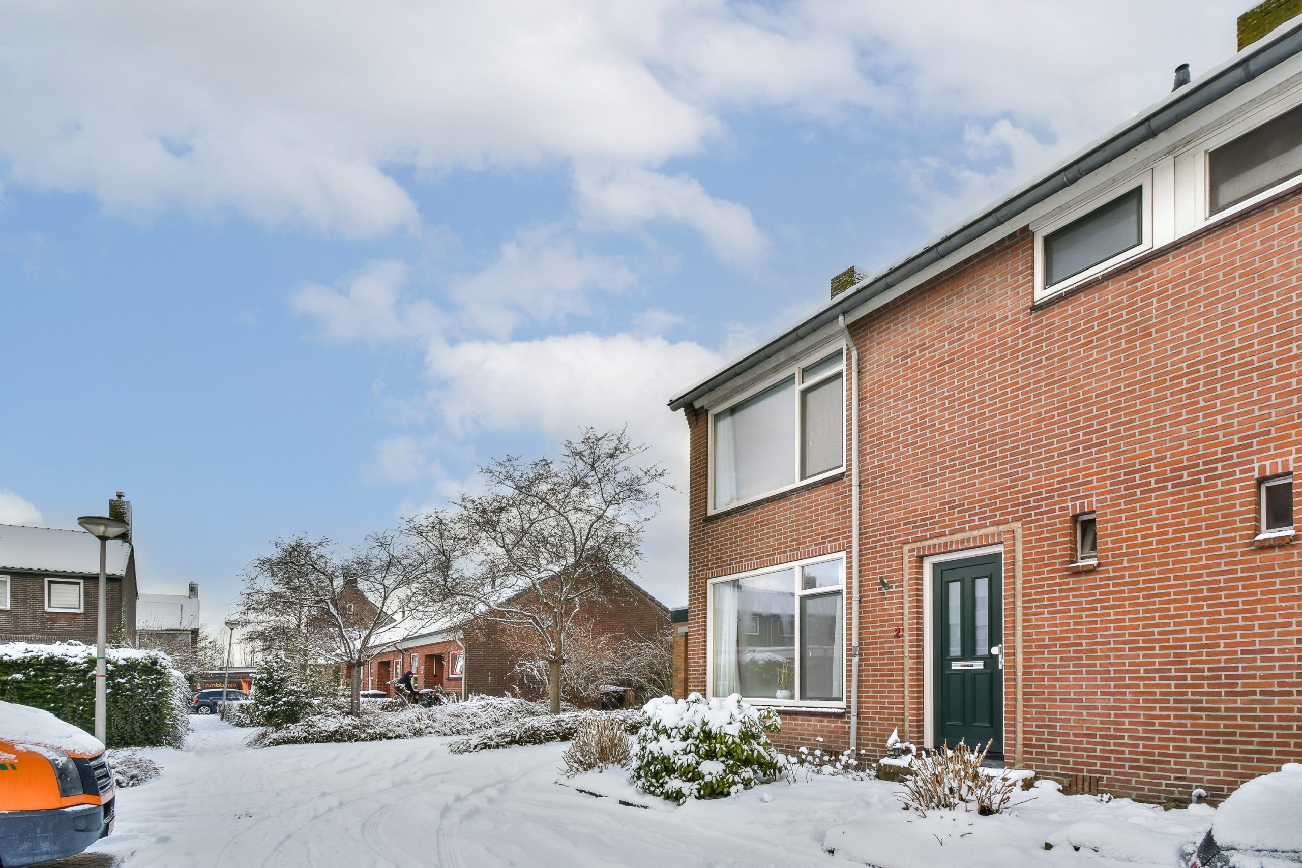 De voortuin is noordgericht, grotendeels betegeld met sierbestrating en voorzien van een plantenperk met vaste beplanting. Voor de garage bevindt zich een oprit waardoor parkeren op eigen grond mogelijk is.